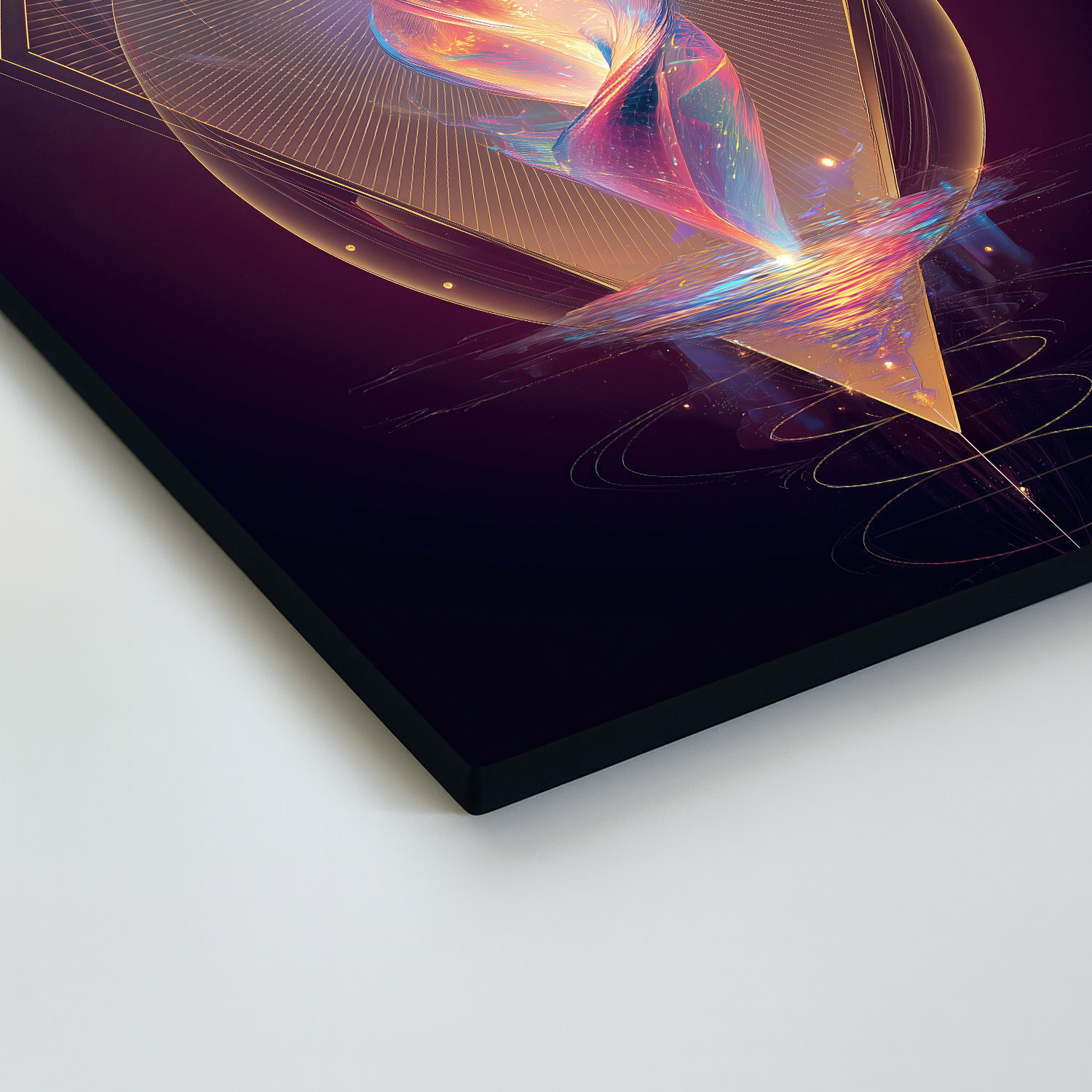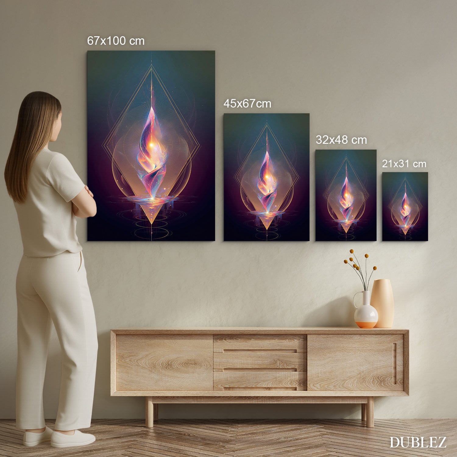 Geometric abstract painting featuring the motif of an ethereal flame in an S-curve and golden lines of sacred geometry brings modern mysticism into the rooms. Rich shades of purple, magenta, and turquoise with a radiant center create a harmonious and elegant effect. The mystical painting stands out in the living room, bedroom, and office.