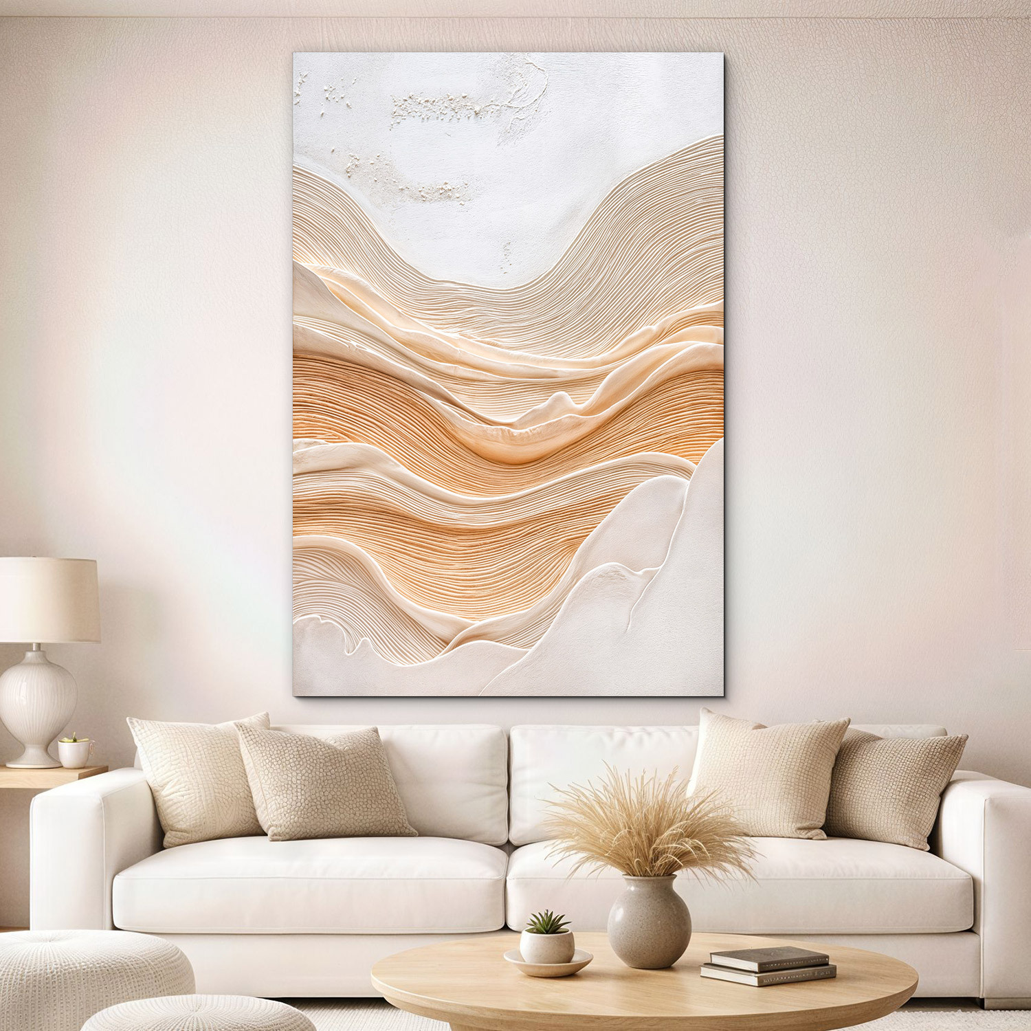 Abstract painting in beige colors captivates with a delicate composition of wavy lines that resemble sand dunes, shaped landscapes, or the fluid movement of nature. Thanks to its subtle processing, it does not appear too striking, but elegantly complements the bedroom or living room. Wooden artwork will be appreciated especially by lovers of clean lines, neutral colors, and decorations that cozy up the interior.