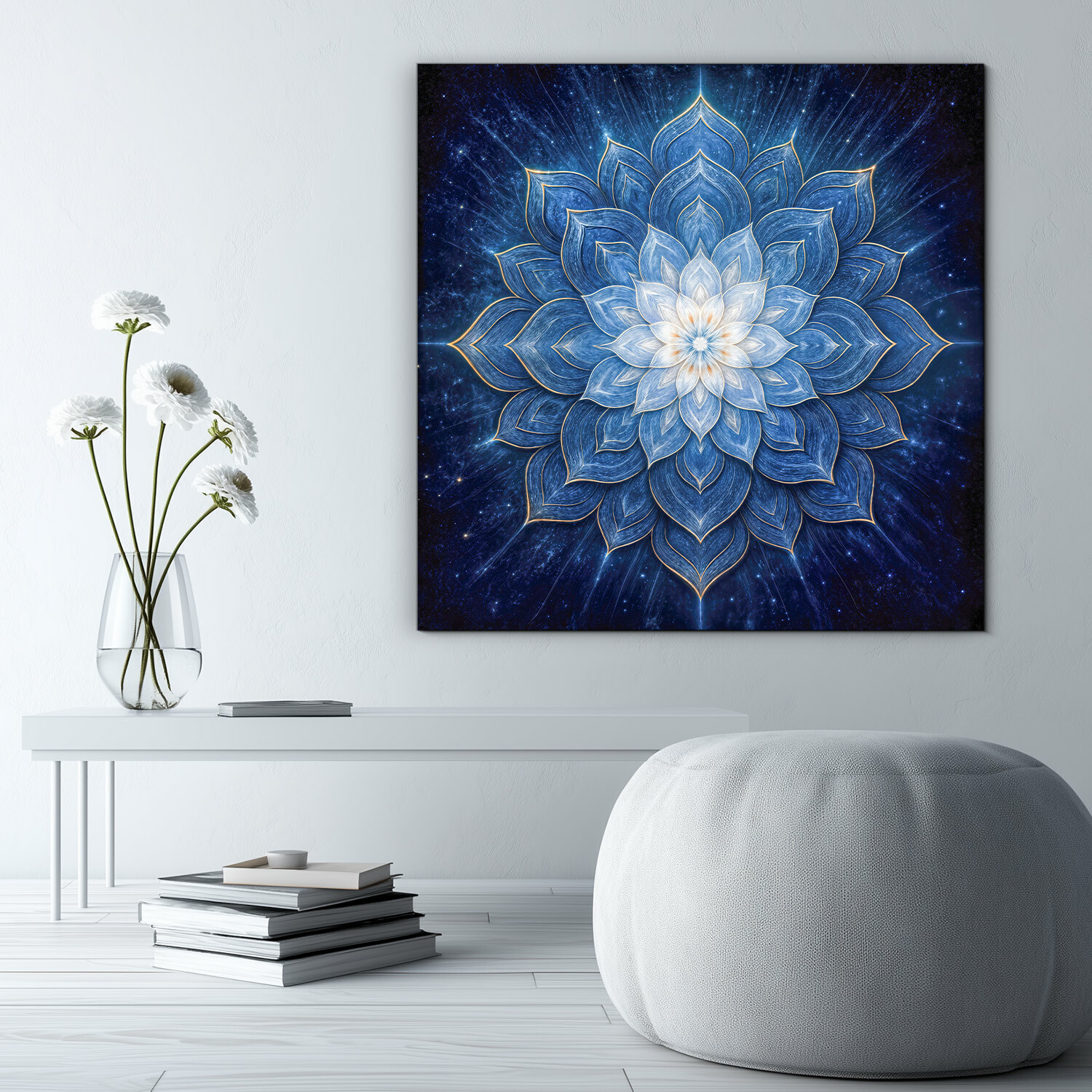 Meaning of the artwork: The starry mandala can serve as a mandala for good sleep – its shapes and colors promote relaxation. The blue color brings tranquility, and white symbolizes purity. Together, they create an image that helps tune into deep sleep.