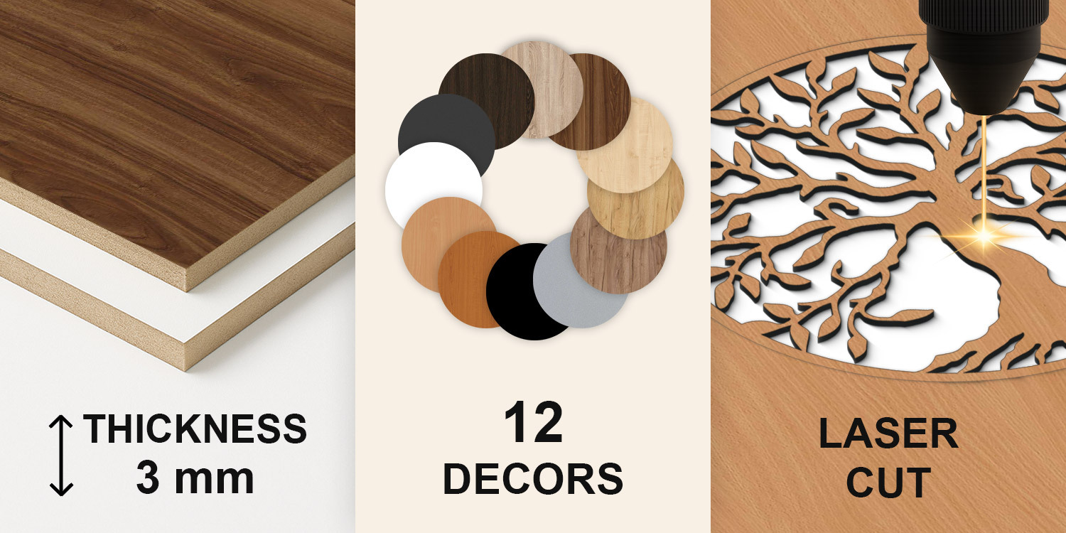 The product is cut using laser technology from a wooden HDF board – a high-density fibreboard made by compressing wood fibers and resin under pressure. The material is durable (3 mm thick), dimensionally stable, with a smooth surface. Thanks to its strength, we're able to cut even fine, delicate details.