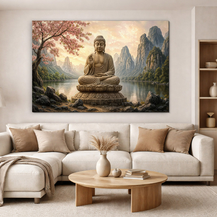 Meaning of the picture: The Buddha motif symbolizes inner peace and balance. The presence of water and mountains enhances the feeling of silence and concentration, making the artwork calming even in a busy interior.