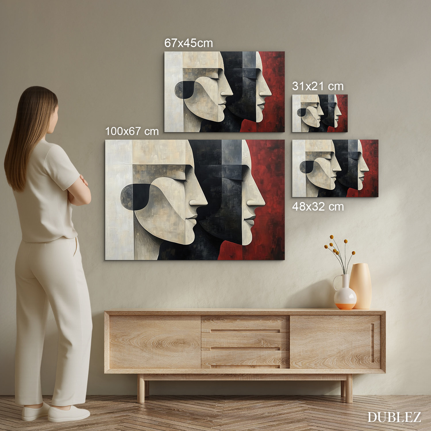 Wooden Wall Art - Sculptures captures two faces in a geometric design, incorporating elements typical of Cubism. This style suits modern interiors, where it stands out with its unique design and brings a touch of avant-garde art to the space. Thanks to its neutral colors, it easily blends with various furniture styles and decor. An original gift for lovers of modern art and design who want to enhance their home with a distinctive piece.