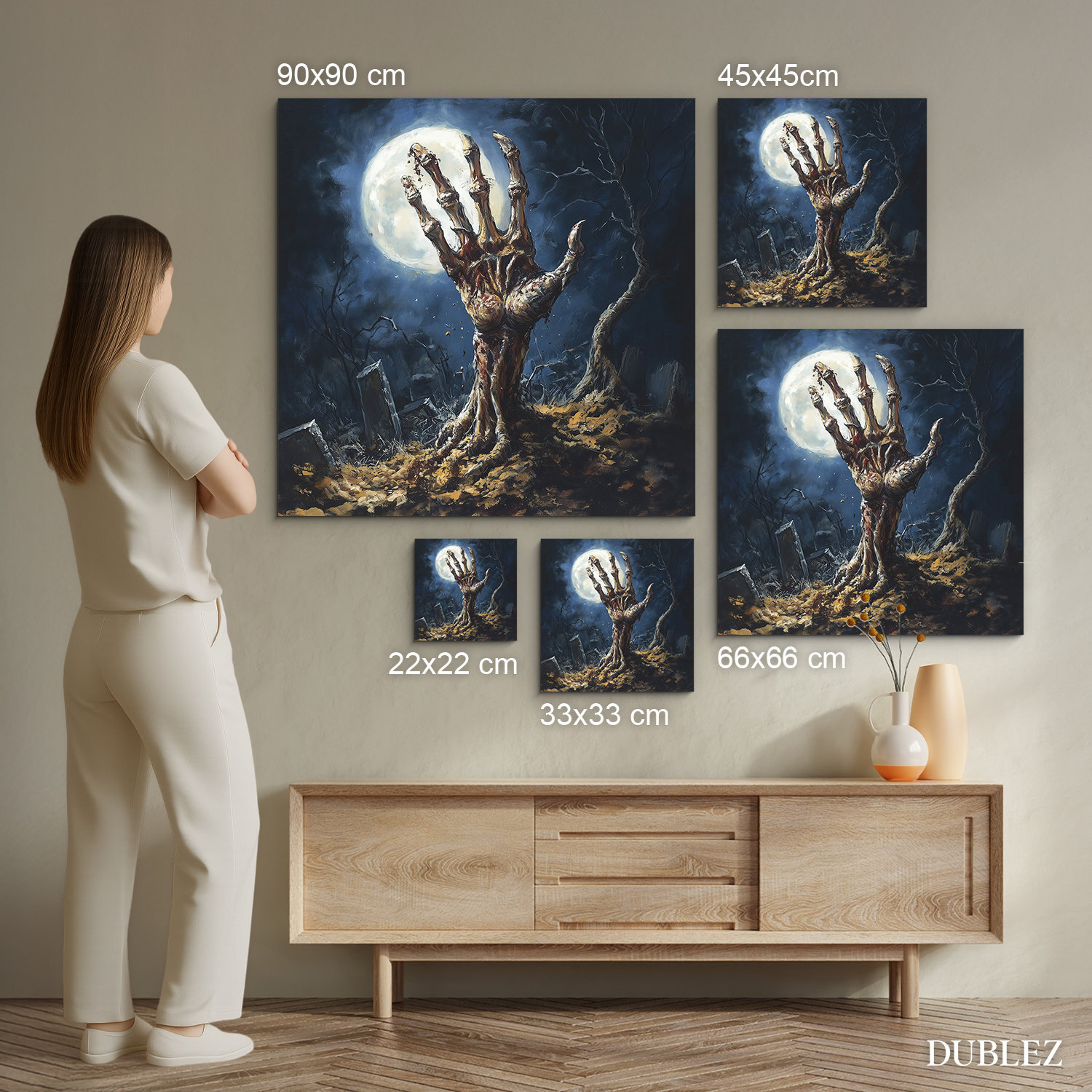 Dark wooden wall art in a horror style captures a terrifying scene where a bony, bloody zombie hand is crawling out of the grave. Its realistic details of bones and flesh combined with a cemetery create a horror atmosphere. The wooden zombie wall art is ideal for the living room above the TV or for a student's room. We recommend buying the wall art as an original gift for zombie fans.