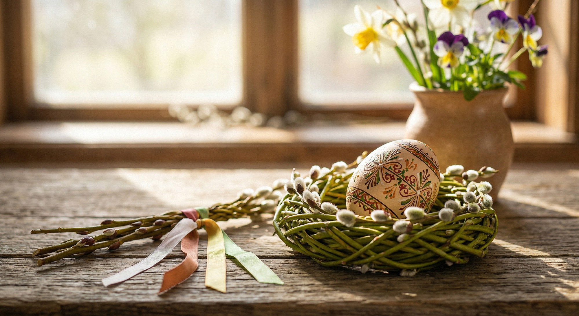 Eating eggs was believed to protect people from negative energy. Young men would braid Easter whips from white willow branches. Once everything was ready, the family dressed in festive clothes to celebrate the blessing of the fire, from which the main Easter candle was lit.