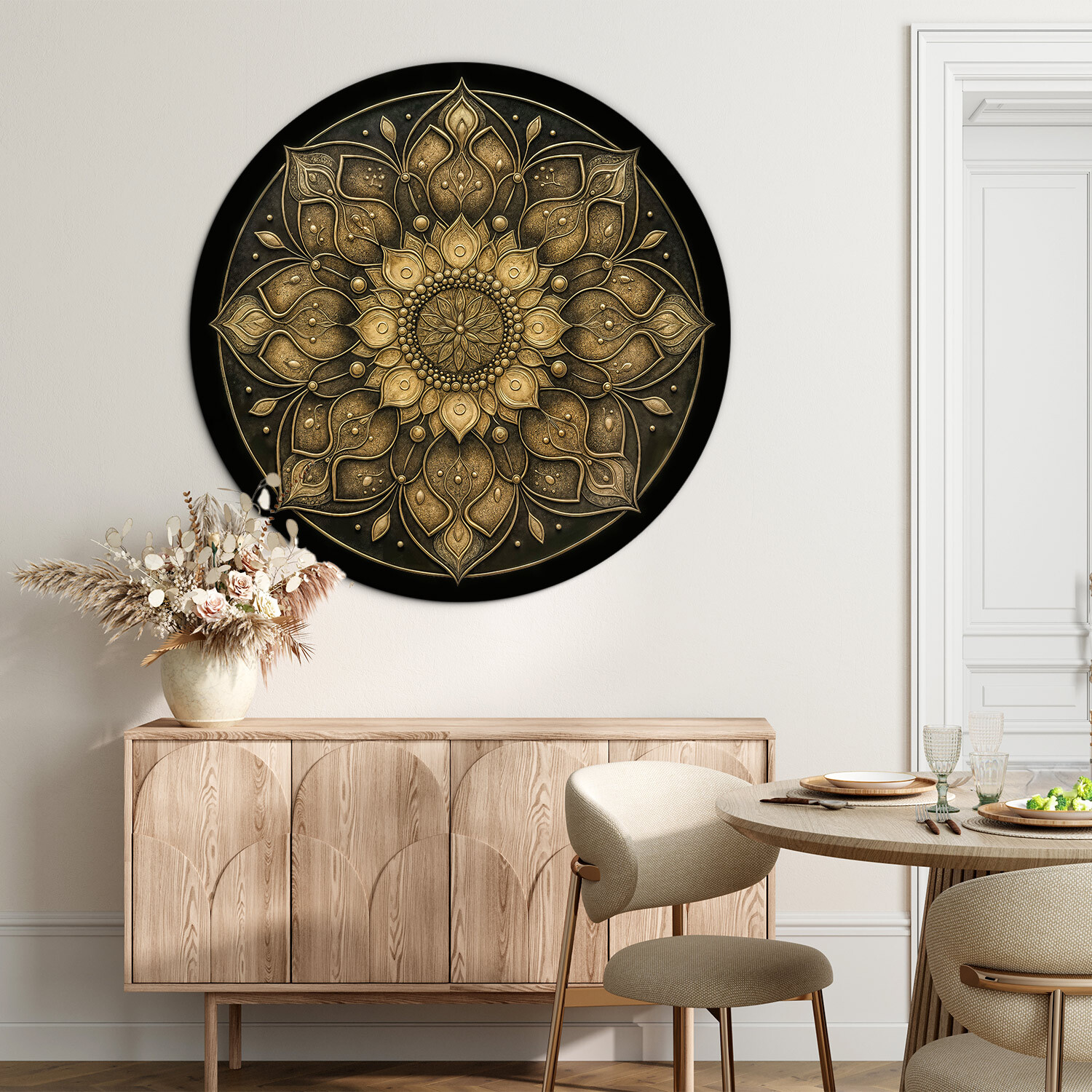 Meaning of the painting: The mandala symbolizes the golden energy of balance and inner strength. It represents the connection between body and mind, light and peace. Placed in the interior, it helps create a sense of harmony, tranquility, and focus.