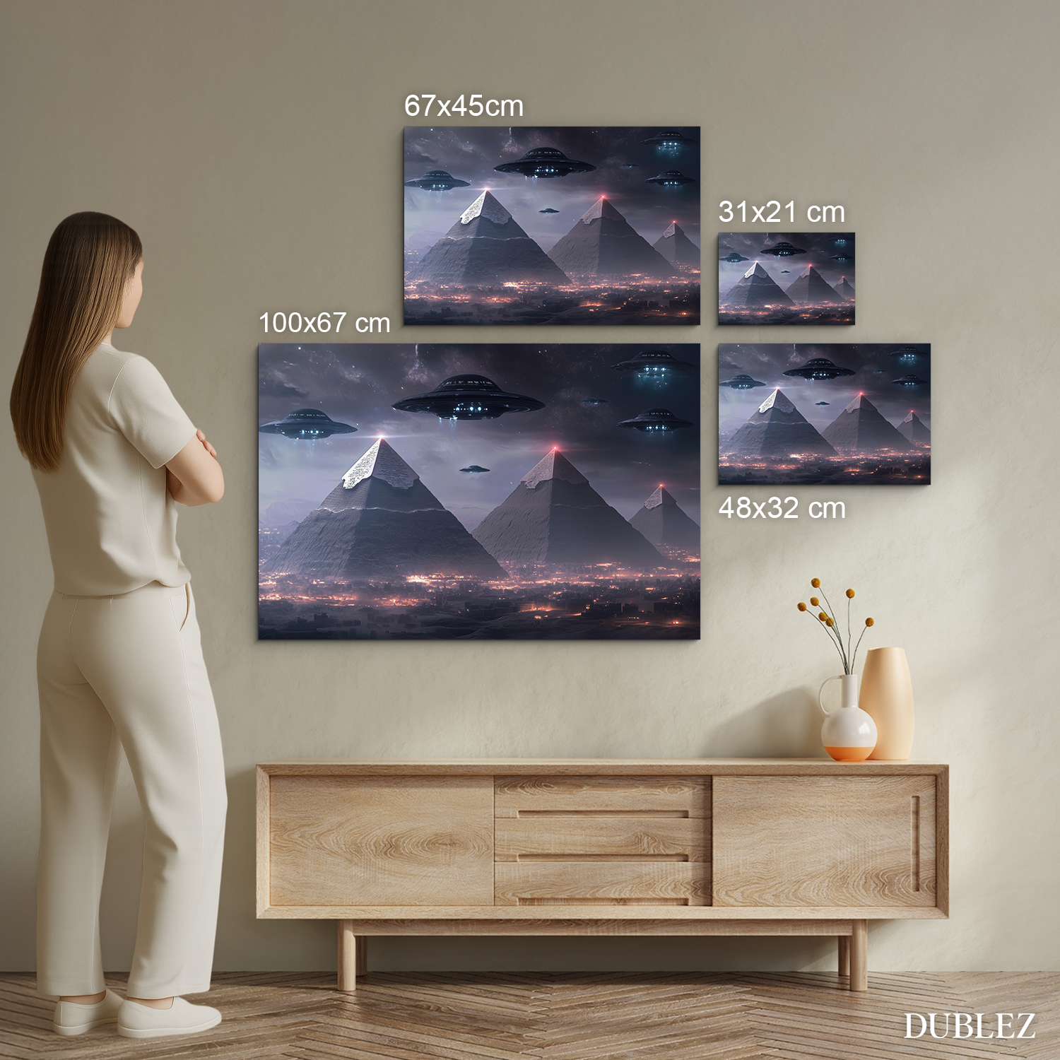 The original futuristic painting captures a mysterious scene of a UFO above the Egyptian pyramids. It combines the sci-fi style of ancient civilization with a modern concept of extraterrestrial life. The wooden painting is ideal for a modern interior, a student room, or an office. We recommend purchasing it as an original gift for fans of sci-fi and space.
