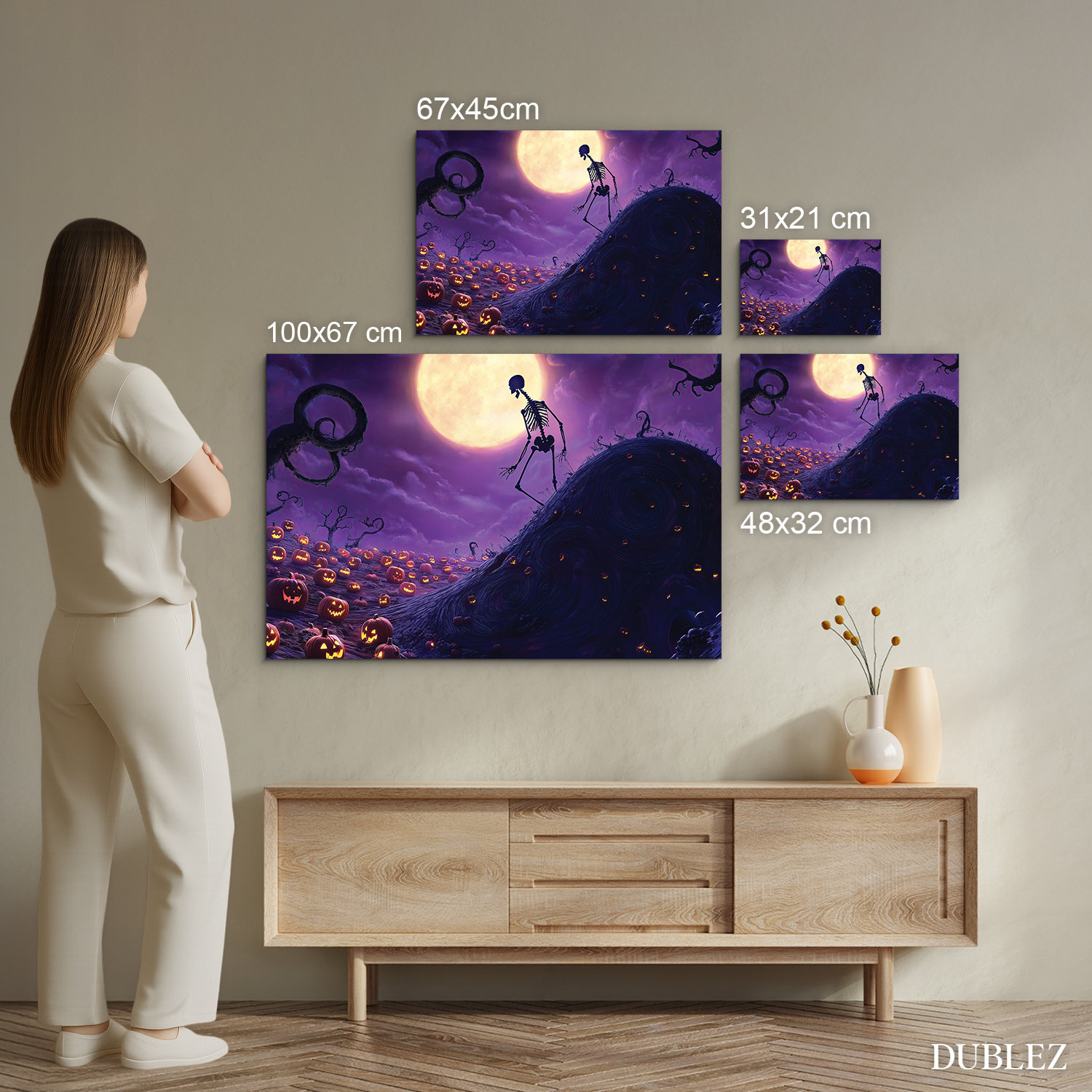 Halloween wall decoration features a dark landscape with a skeleton, resembling a scene from a fantasy world. This artwork is a charming addition to any wall, perfect for cafés, offices, or shopping centers to add a seasonal touch to the interior.