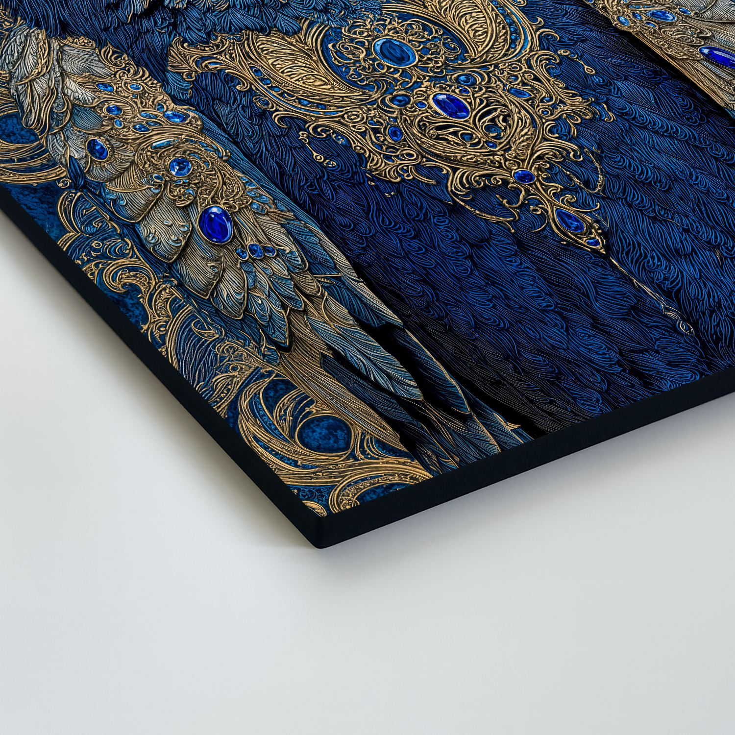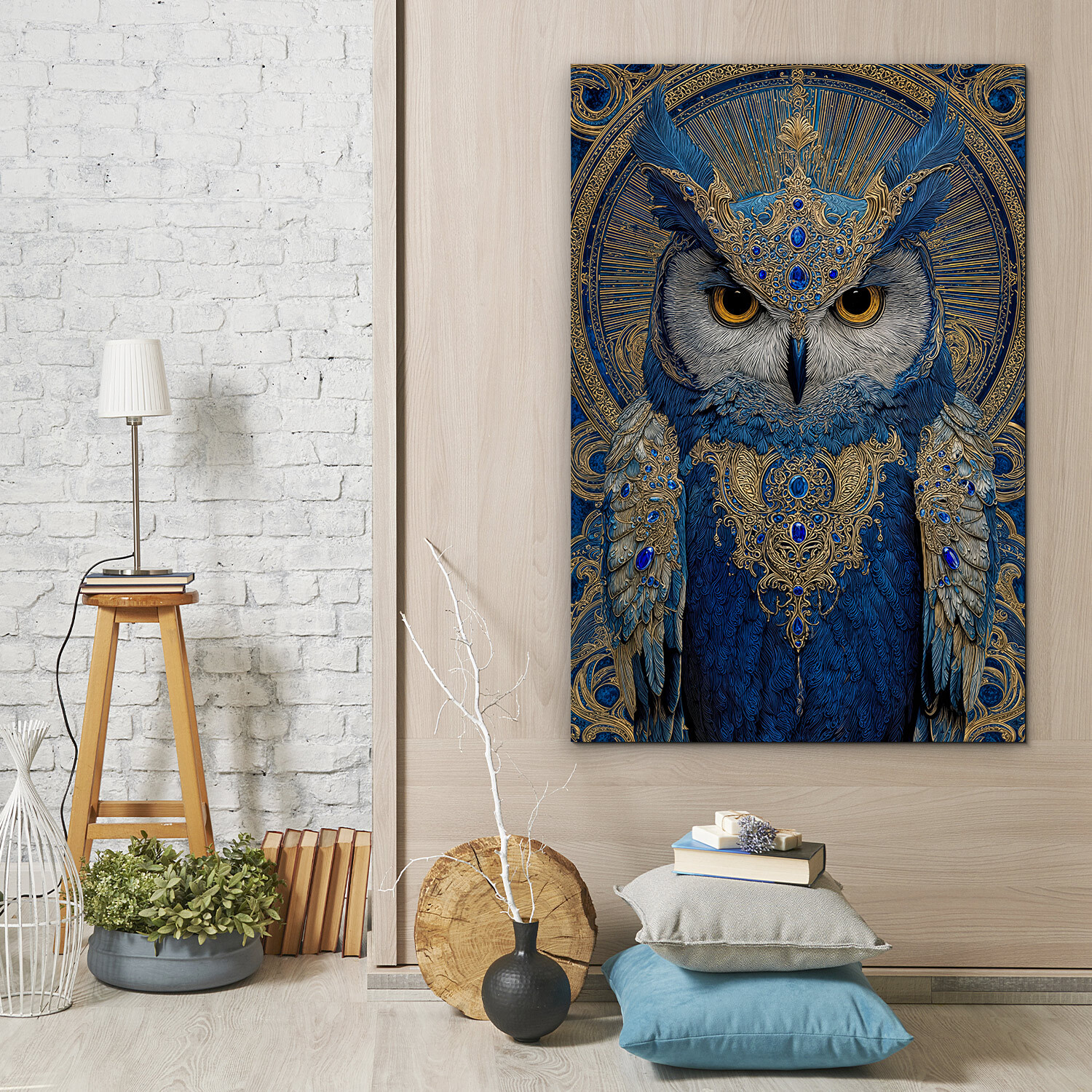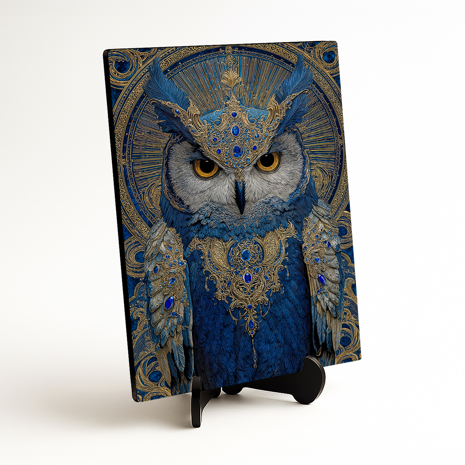 Wooden picture of a blue owl in royal design with golden ornaments acts as a symbol of wisdom and protection. Precise details and luxurious combination of blue and gold colors make it a designer piece. The wooden picture of the owl is ideal for a modern living room, stylish office, or bedroom.