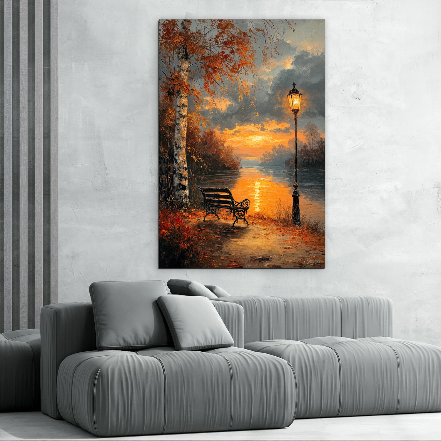 Modern landscape wall art – Autumn sunset by the lake captures a romantic moment of silence. A bench, a street lamp, and the setting sun above the surface create an atmosphere of peaceful autumn. The wooden artwork looks painted and fits in the bedroom, living room, or hallway.