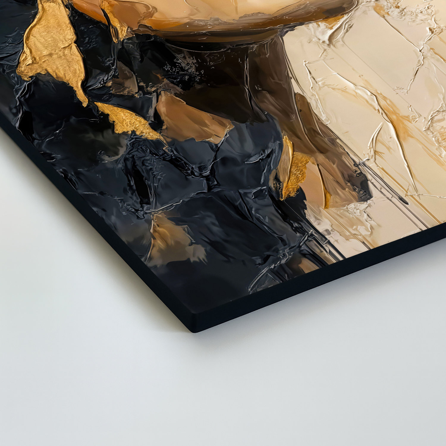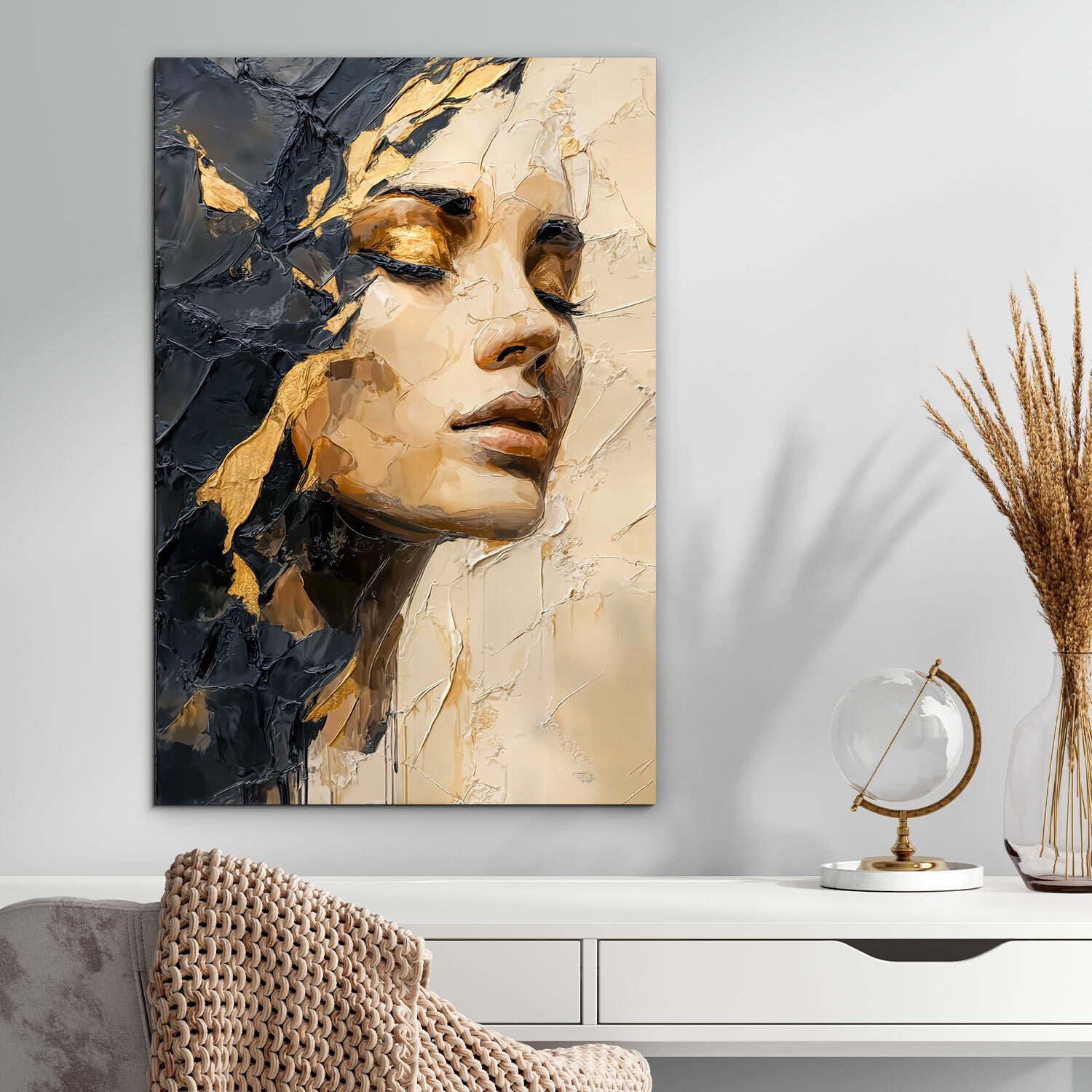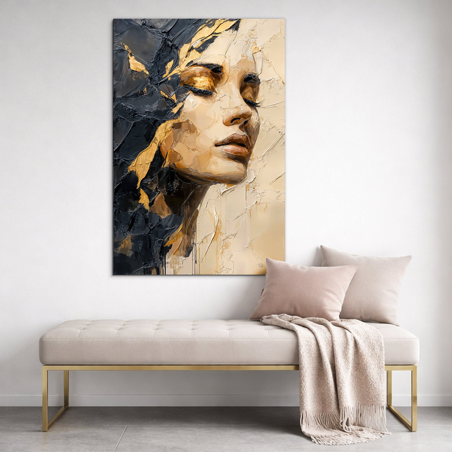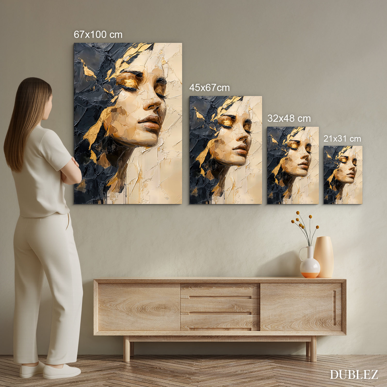 Luxury painting of a woman titled Golden Aura captures delicacy and strength in perfect balance. The profile of the woman with closed eyes appears as a painted work with a distinct texture, but in reality, it is a modern UV print on wood with precise detail processing. The designer wall art is the perfect choice for a bedroom, where it emphasizes the intimate atmosphere and sensuality, but it also stands out in a modern glamour living room interior.