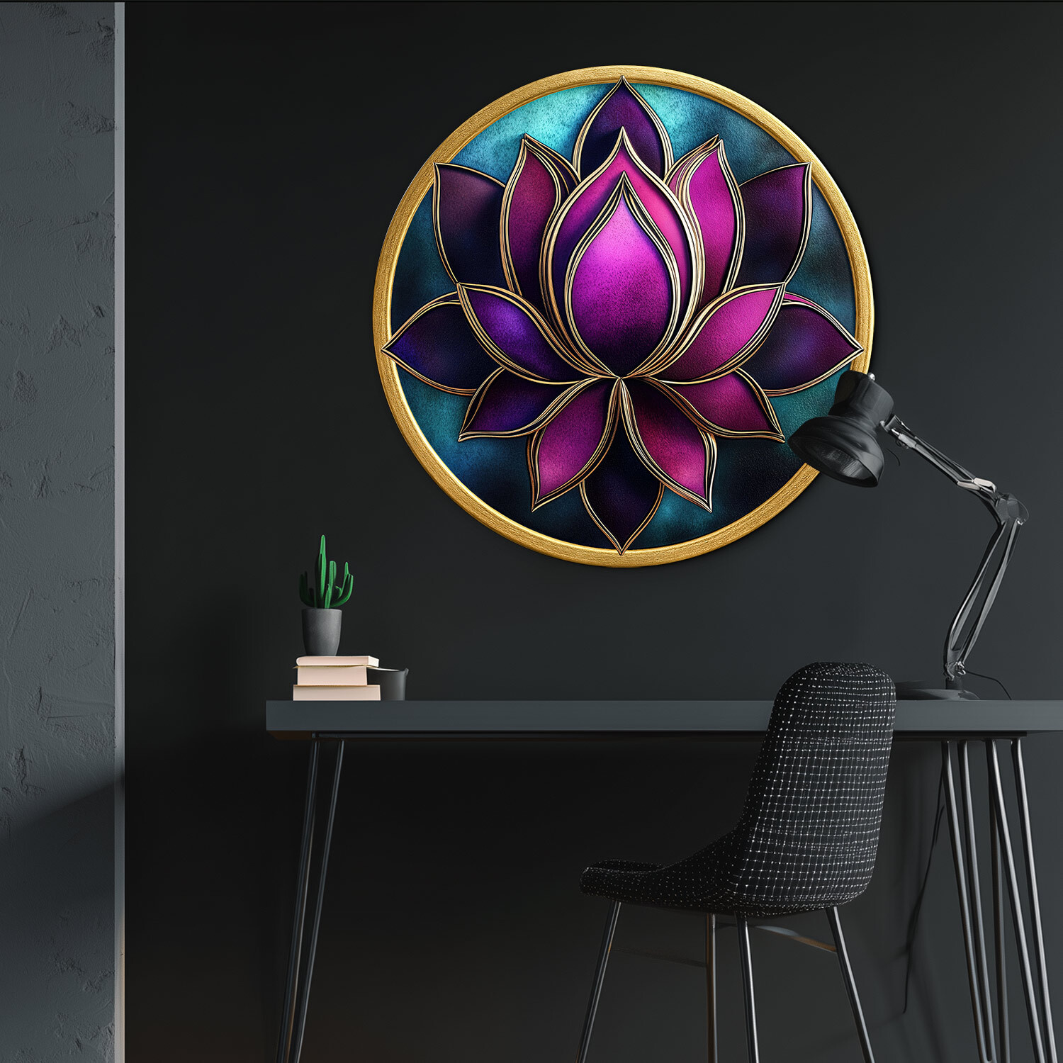 Luxury mandala painting with a floral lotus motif that enchants with its colors and symbolism. A wooden round mandala in shades of purple and blue with a golden frame, which appears elegant, harmonious, and modern. The mandala painting stands out in the living room or bedroom as a stylish design accessory for the interior.
