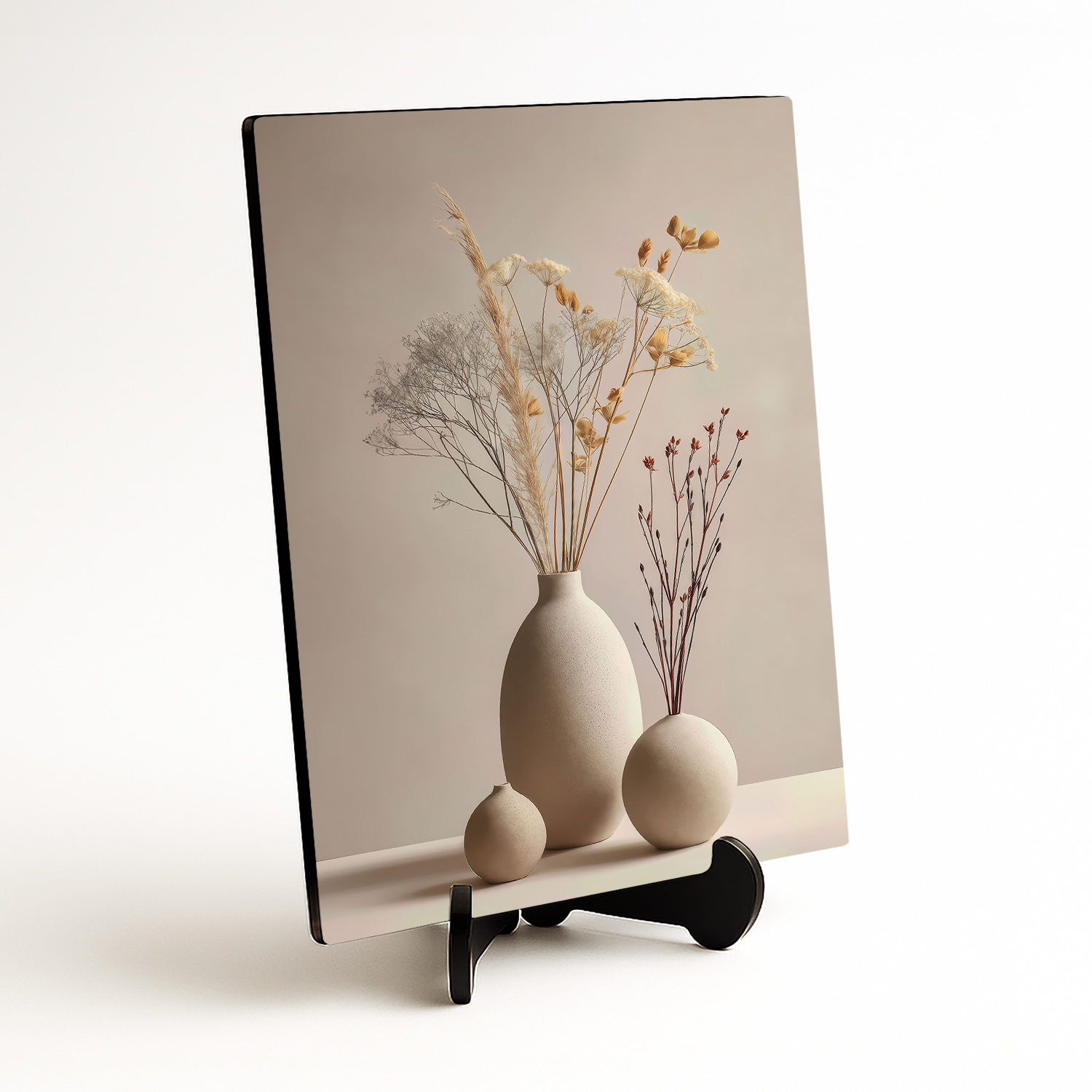 Cozy up your home with the gentle elegance of dried flowers. A minimalist painting with a natural motif of three vases looks clean, calm, and discreet. Thanks to the neutral colors, it fits almost any interior – it will perfectly blend into the living room, hallway, bedroom, or office. It is the ideal choice for those who appreciate simplicity, nature, and modern style.