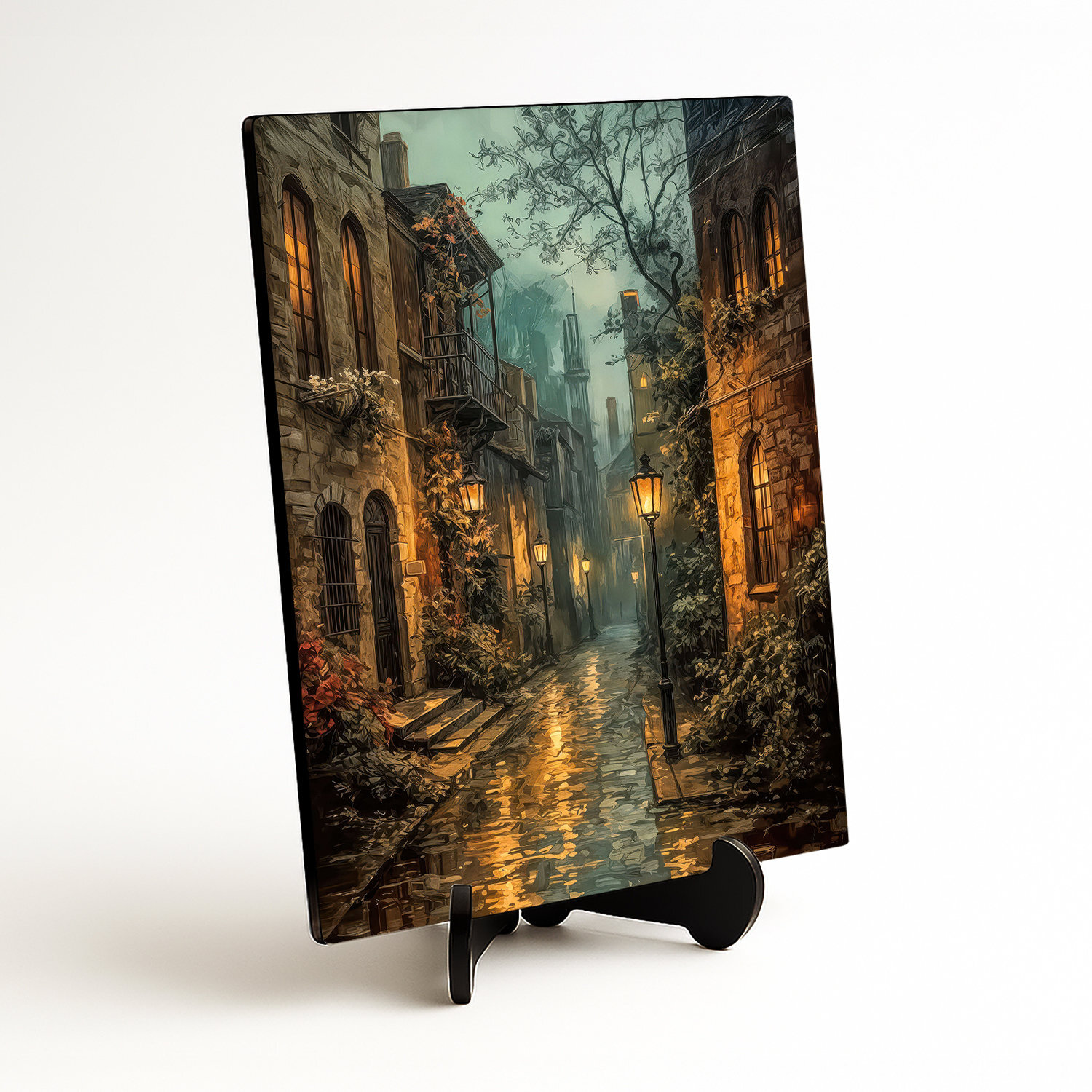 Wooden painting in the style of expressionist painting captures the captivating atmosphere of a historic alley after the rain. The light of the street lamps reflects off the wet pavement, creating the ambiance of an evening city. In the interior, it beautifully stands out especially in the living room, hallway, study, or in a cozy reading nook, where it evokes a sense of intimacy and pleasant silence. It fits perfectly into vintage, romantic, classic, and elegant interiors.