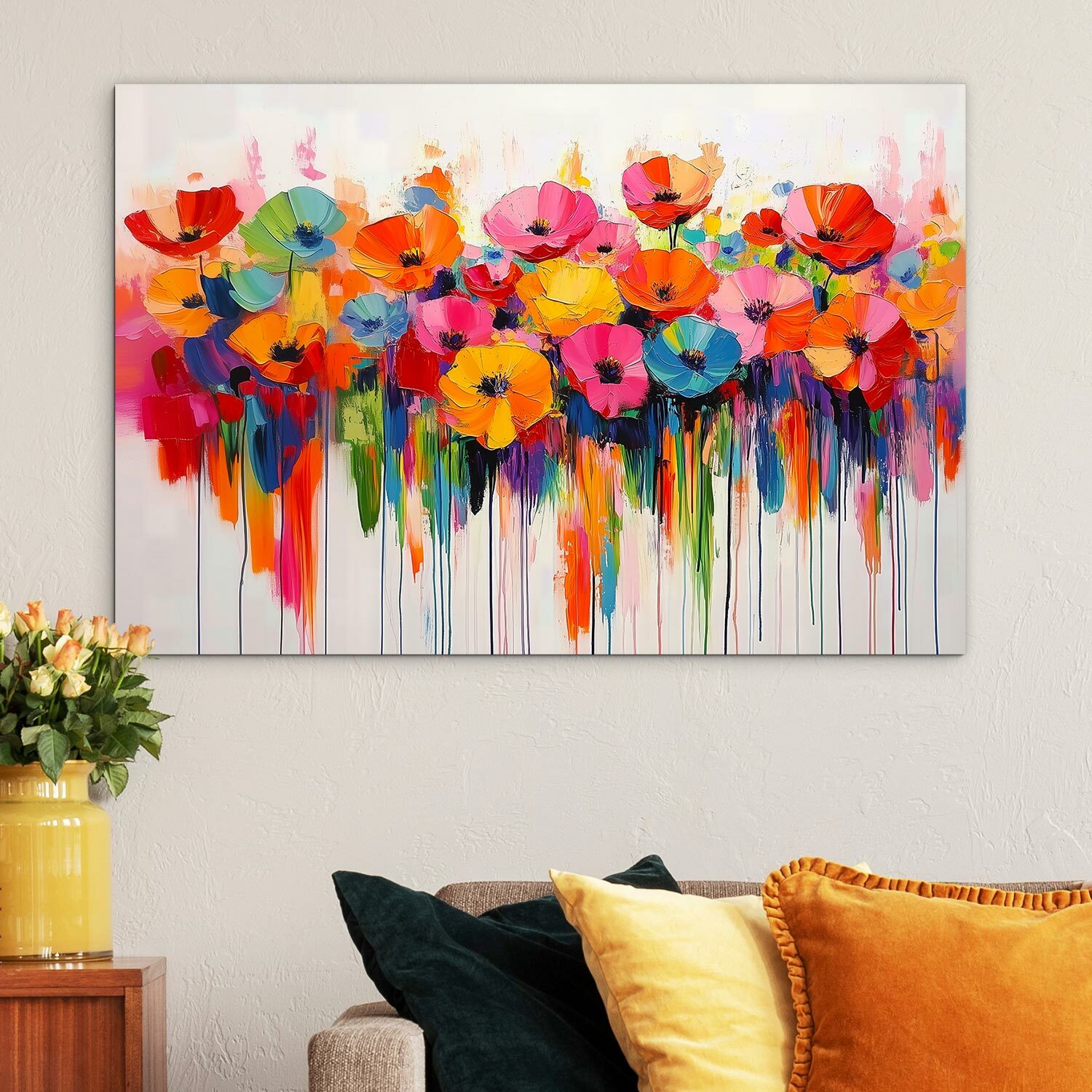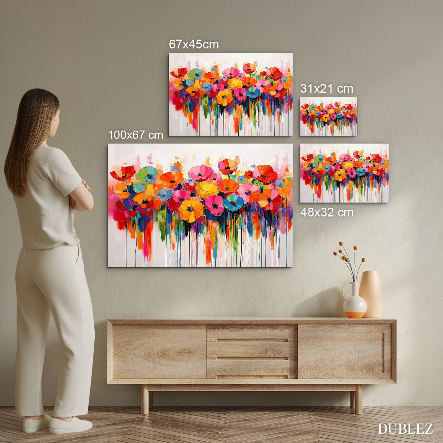 Wooden flower painting in modern style brings energy, optimism, and unrestrained creativity to the interior. The painting features approximately 30 painted flowers, with their stems and colors freely dripping downwards. The color palette is exceptionally rich – ranging from yellow, red, pink, orange, to turquoise and blue, all the way to dark purple. The colors are vivid, pure, and give the impression of being applied with a spatula or palette knife.