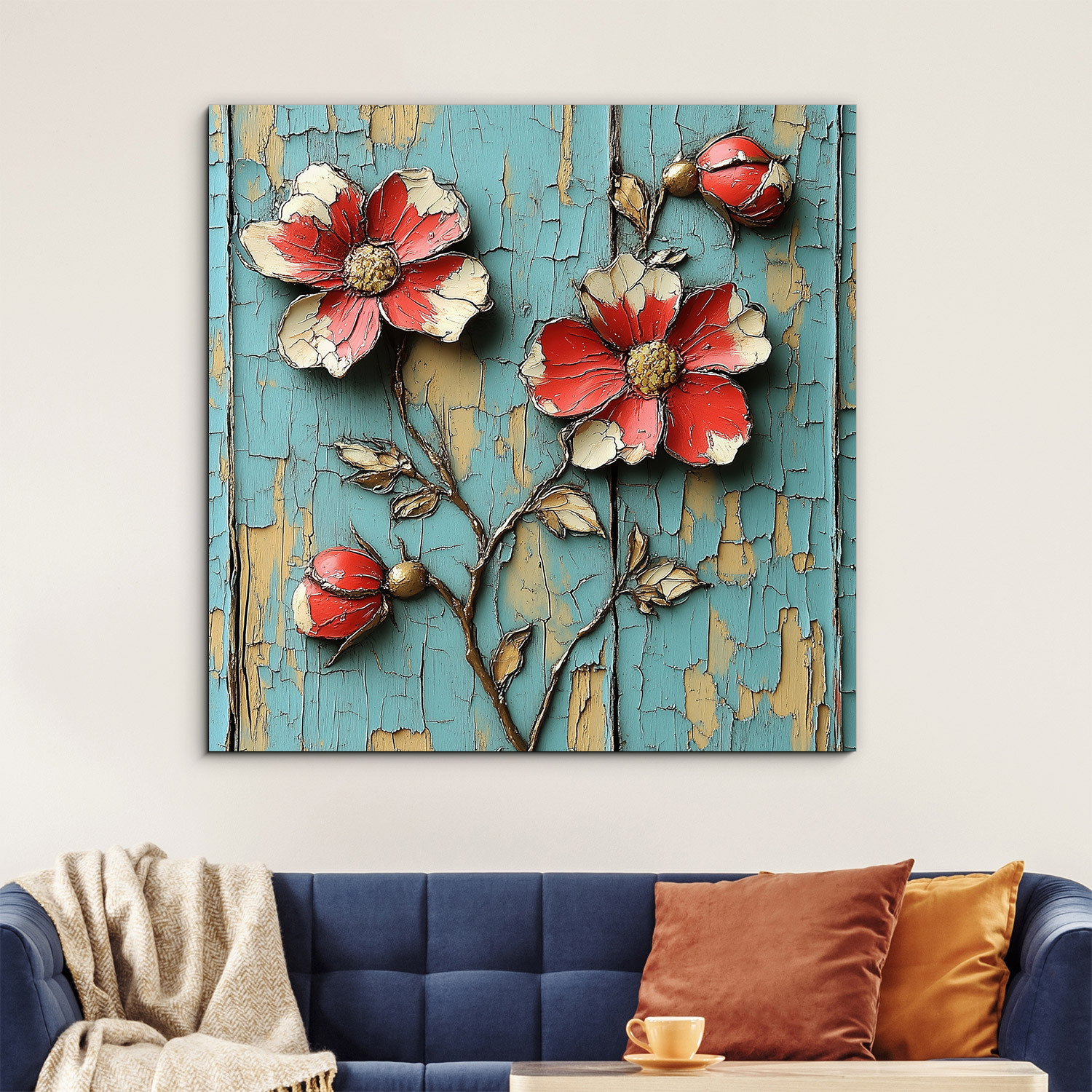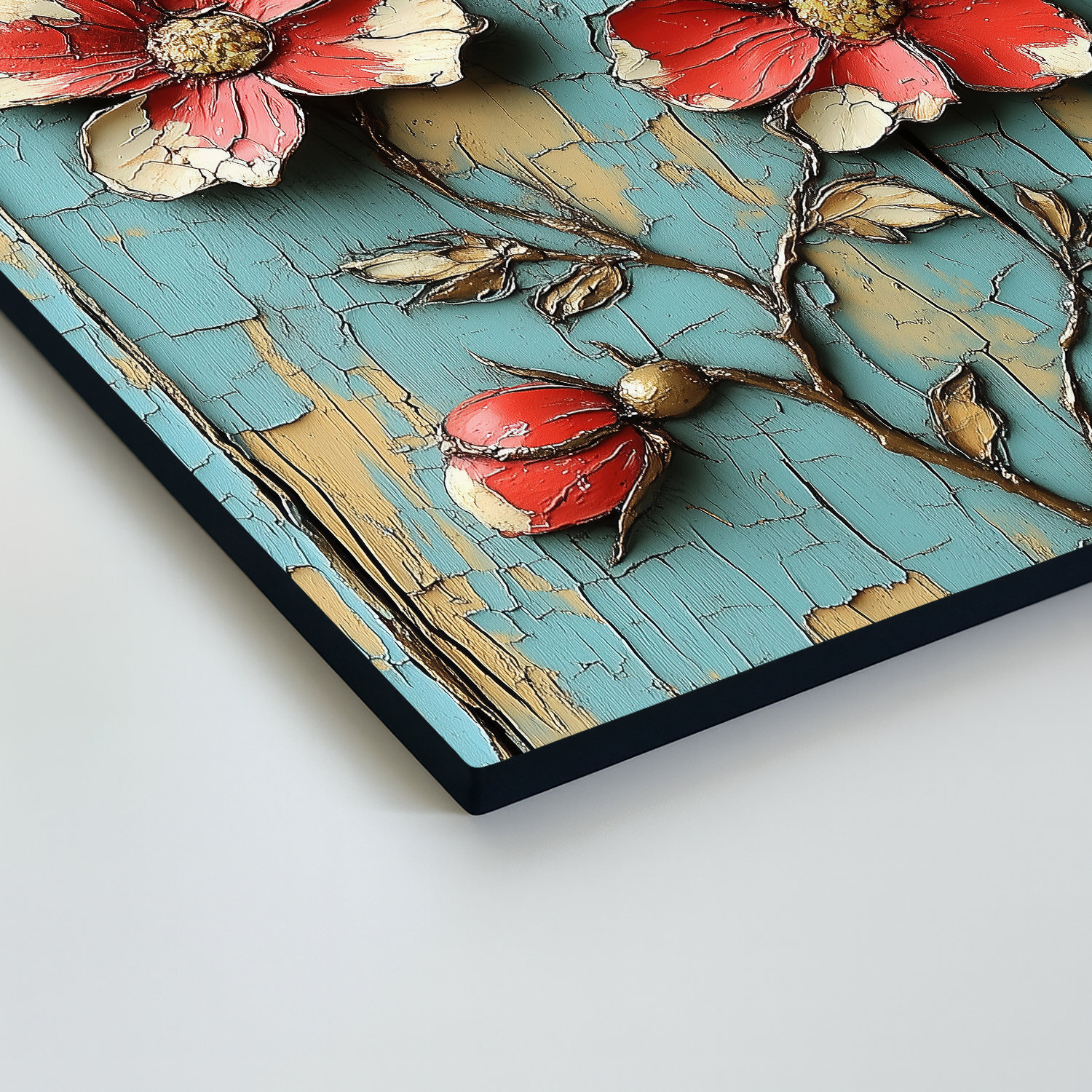 Retro wall art brings a dose of delicacy and romance to your interior. The floral painting resembles old painted wood with a relief effect that highlights the red flowers. The cracked surface, warm colors, and natural tones create an authentic vintage atmosphere. It fits perfectly in the kitchen, living room, hallway, or cottage – simply where every decoration has its story.