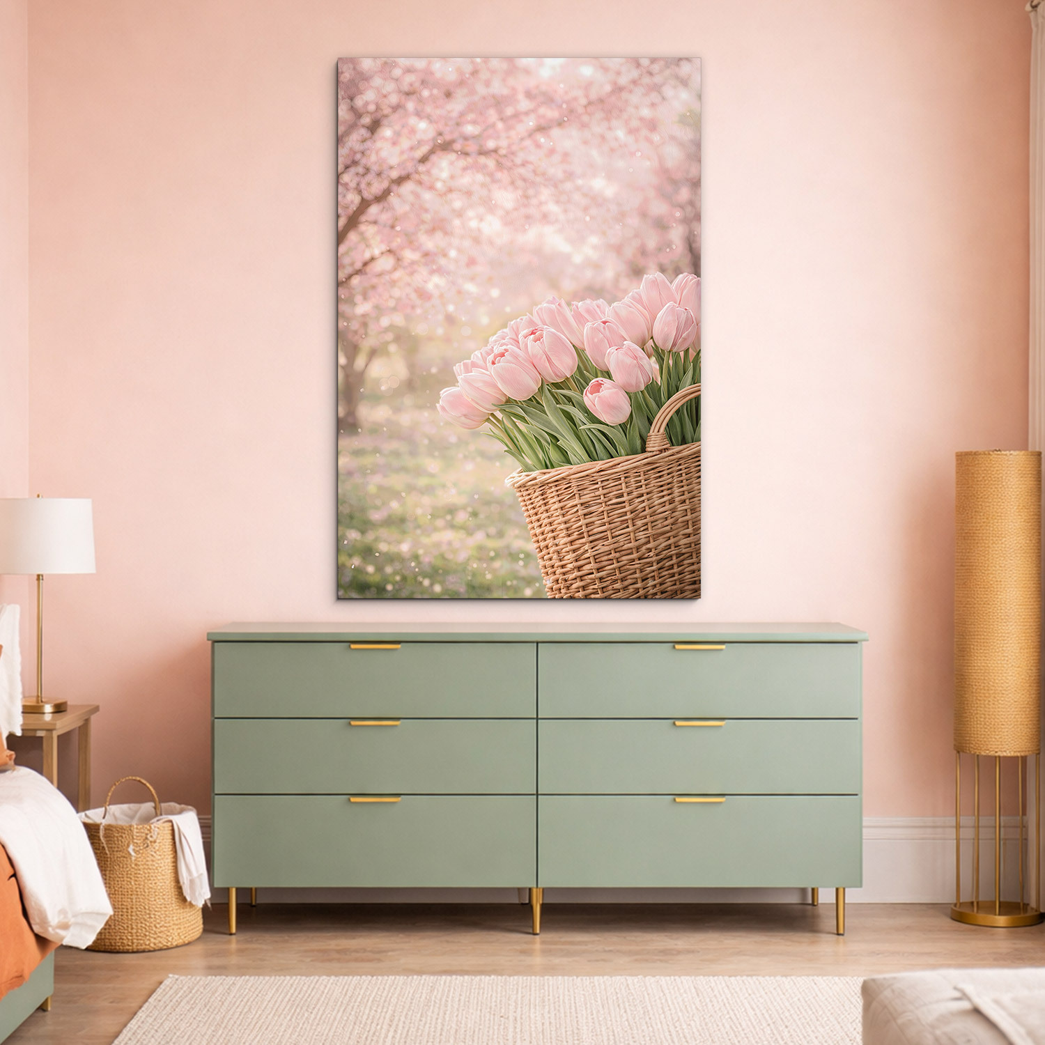 The romantic image of tulips in a wicker basket captures the charm of a spring morning under blooming trees. The detailed depiction of delicate pink petals creates the impression that you are just walking through a blooming garden. The wooden image of tulips is perfect as an original gift for a woman, a lover of nature, flowers, or spring themes.