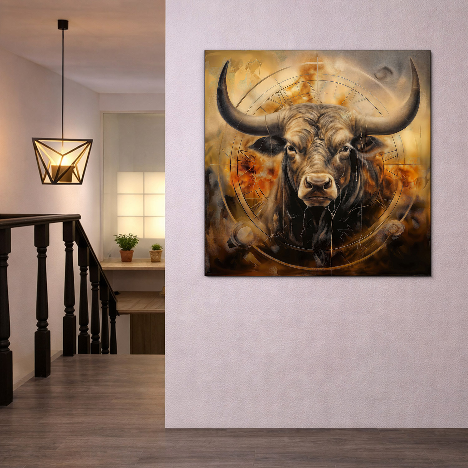The wooden painting Golden Bull embodies energy, perseverance, and unwavering strength. The intricately depicted head of the bull with powerful horns against a background of abstract geometric lines creates a deep artistic experience that feels modern yet timeless. Thanks to the precise wood printing technique, the painting fits perfectly into interiors styled in industrial, modern, or minimalist styles.