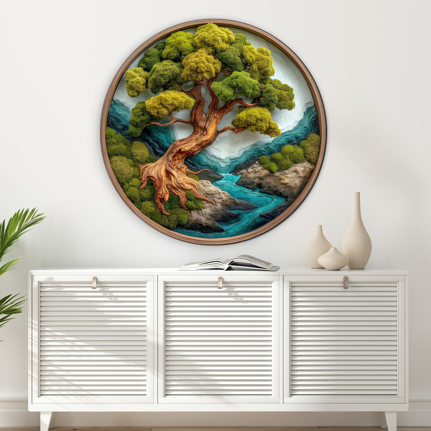 Wooden Tree of Life Wall Art Printed with Premium Colors resembles a moss-covered bonsai. The robust tree with a distinctively shaped trunk stands out with a realistic wood appearance, featuring rich textures and beautiful colors. The background is a color-layered landscape - river, mountains, and sky blend in gentle lines. This circular wooden wall art beautifully complements a living room, bedroom, or kitchen.