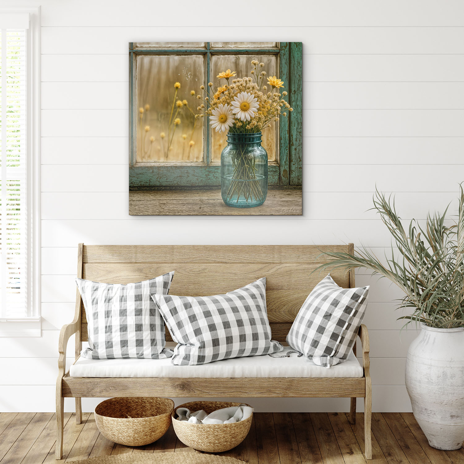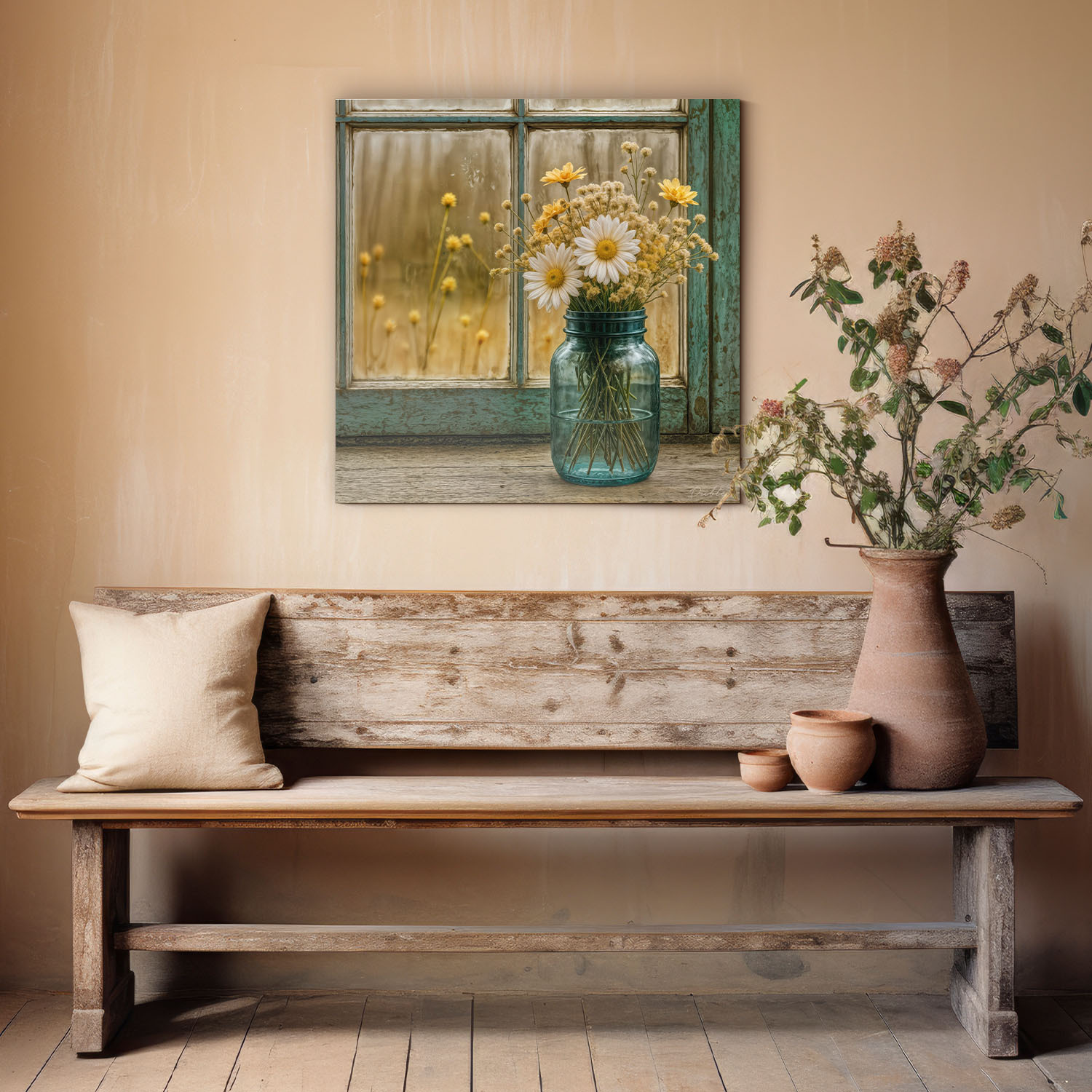Vintage picture for the kitchen – Vase with meadow flowers will bring coziness, delicacy, and a romantic atmosphere to the interior. The combination of yellow and white flowers in a vase in front of an old window creates a peaceful motif that beautifully complements a rustic kitchen, dining room, or living room. The yellow color symbolizes joy and optimism, while white represents purity and tranquility. Together with the patinated window frame, it creates a romantic picture that evokes memories of summer days and the scent of meadow flowers.