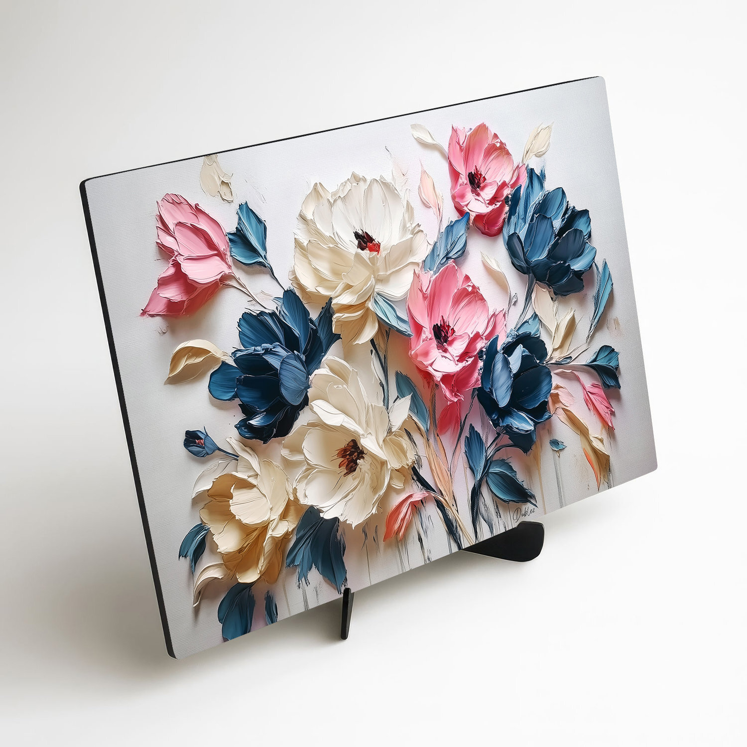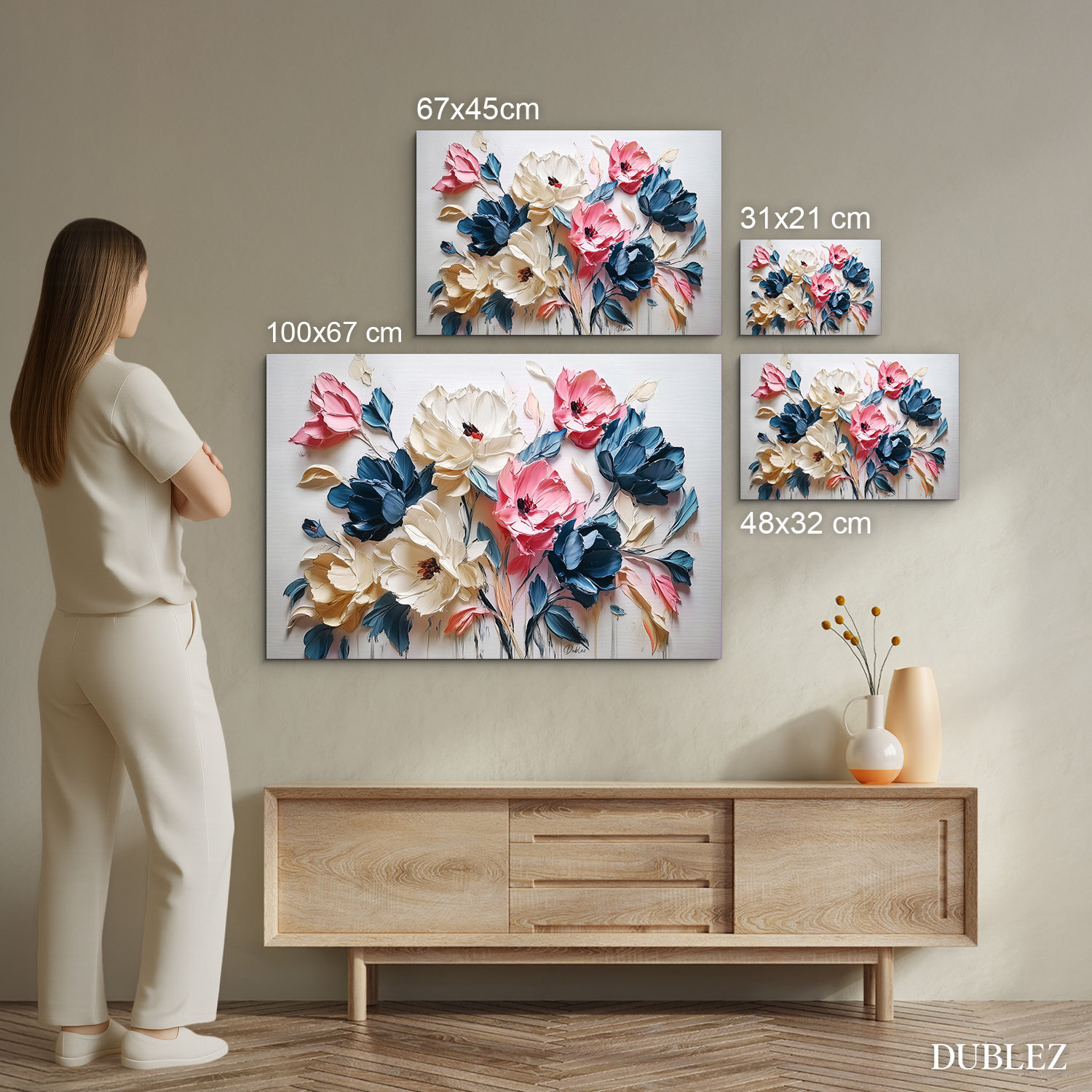 Wall Art for Living Room – Flowers brings color and positive energy to your space. The combination of pink, cream, and dark blue flowers is striking yet tasteful. The 3D effect of painted flowers stands out even on a larger wall in the living room. An original gift for a woman who loves flowers and stylish interiors.