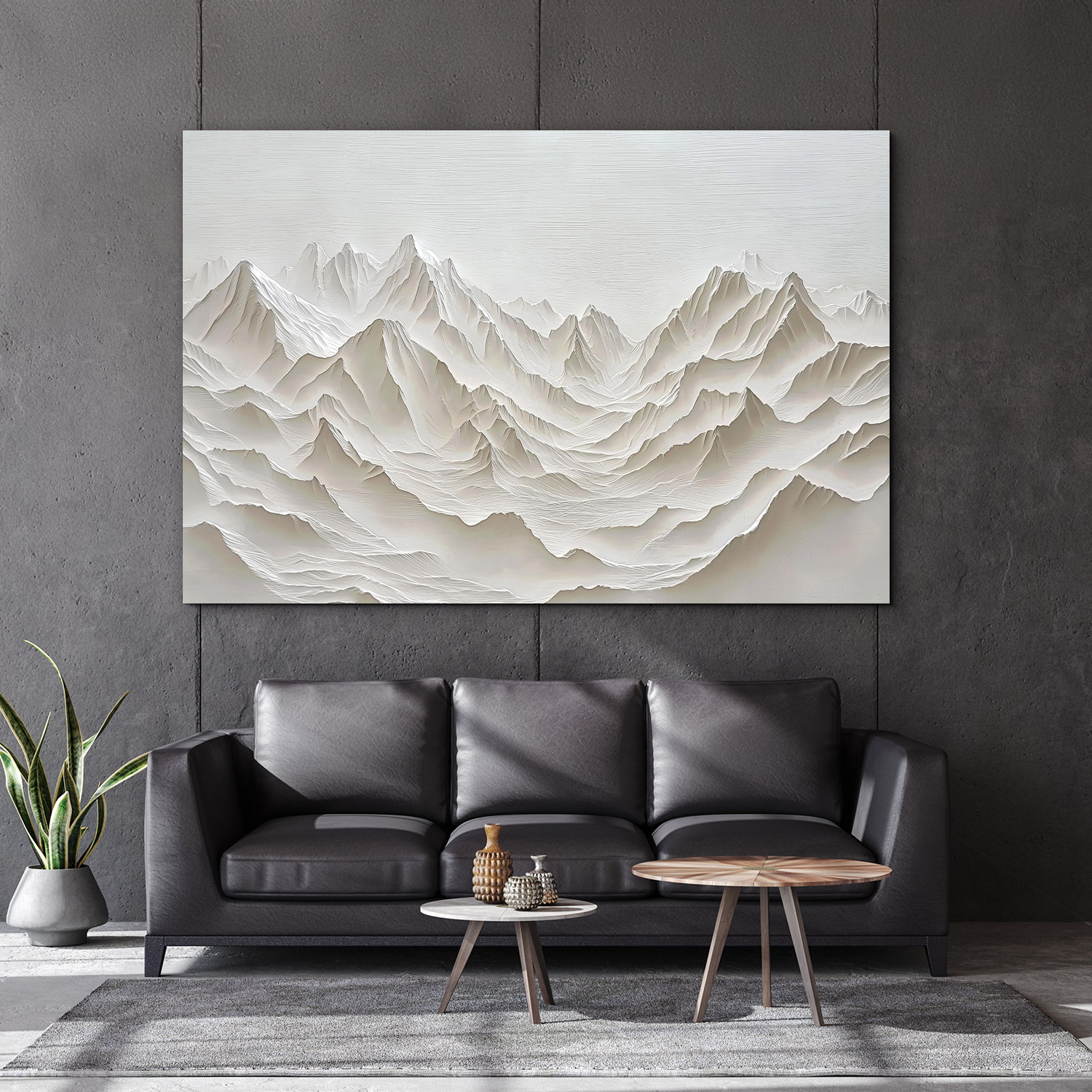 Minimalist painting - White mountains perfectly fit into a modern interior, where it stands out with its purity and timeless design. Detailed UV printing with premium colors creates an imitation of plaster relief, which appears plastic and realistic. The delicate lines of the mountain ranges in a white palette give the painting depth and a 3D effect. The wooden painting is an ideal addition to the living room, office, or minimally furnished interior. An original gift for lovers of mountains and clean design.