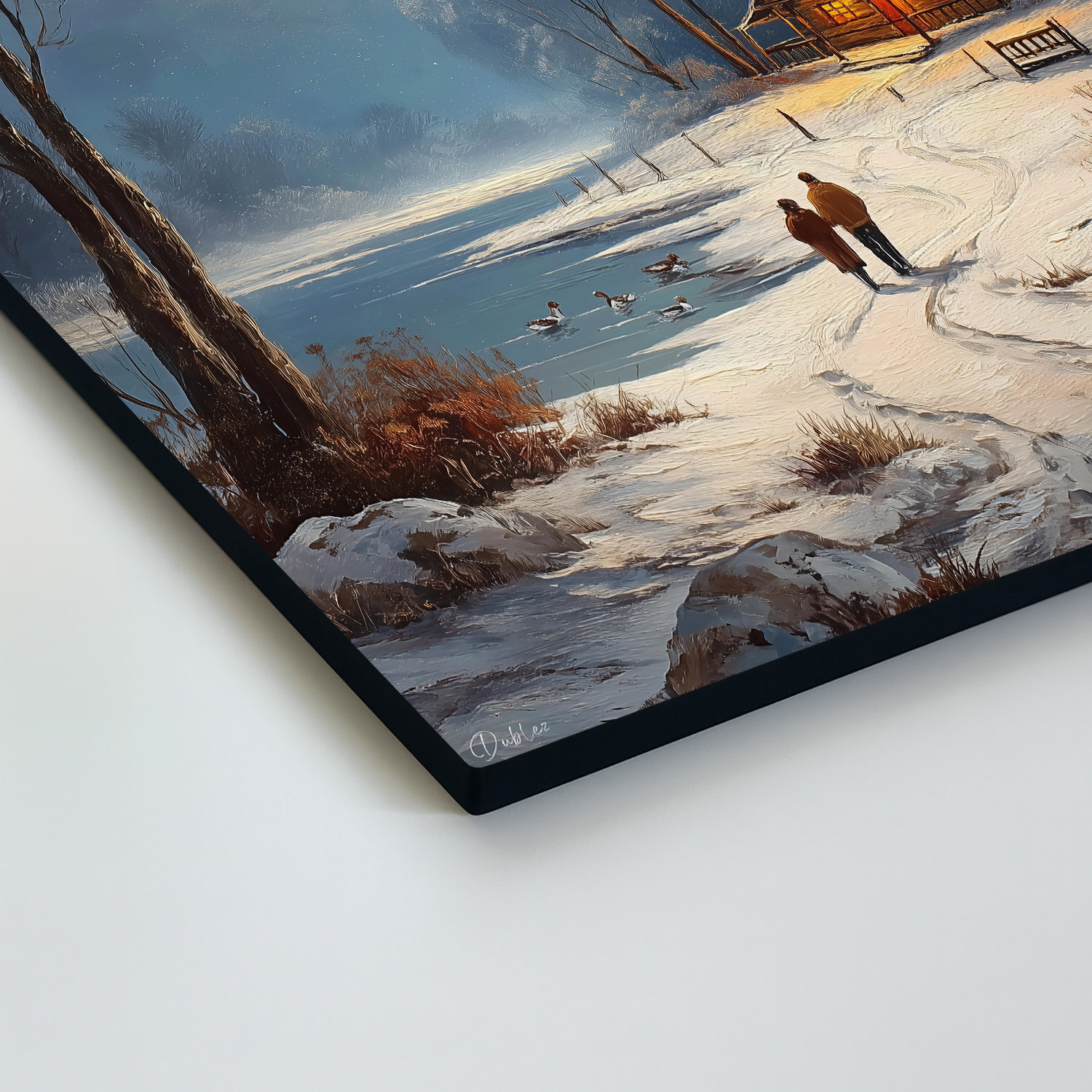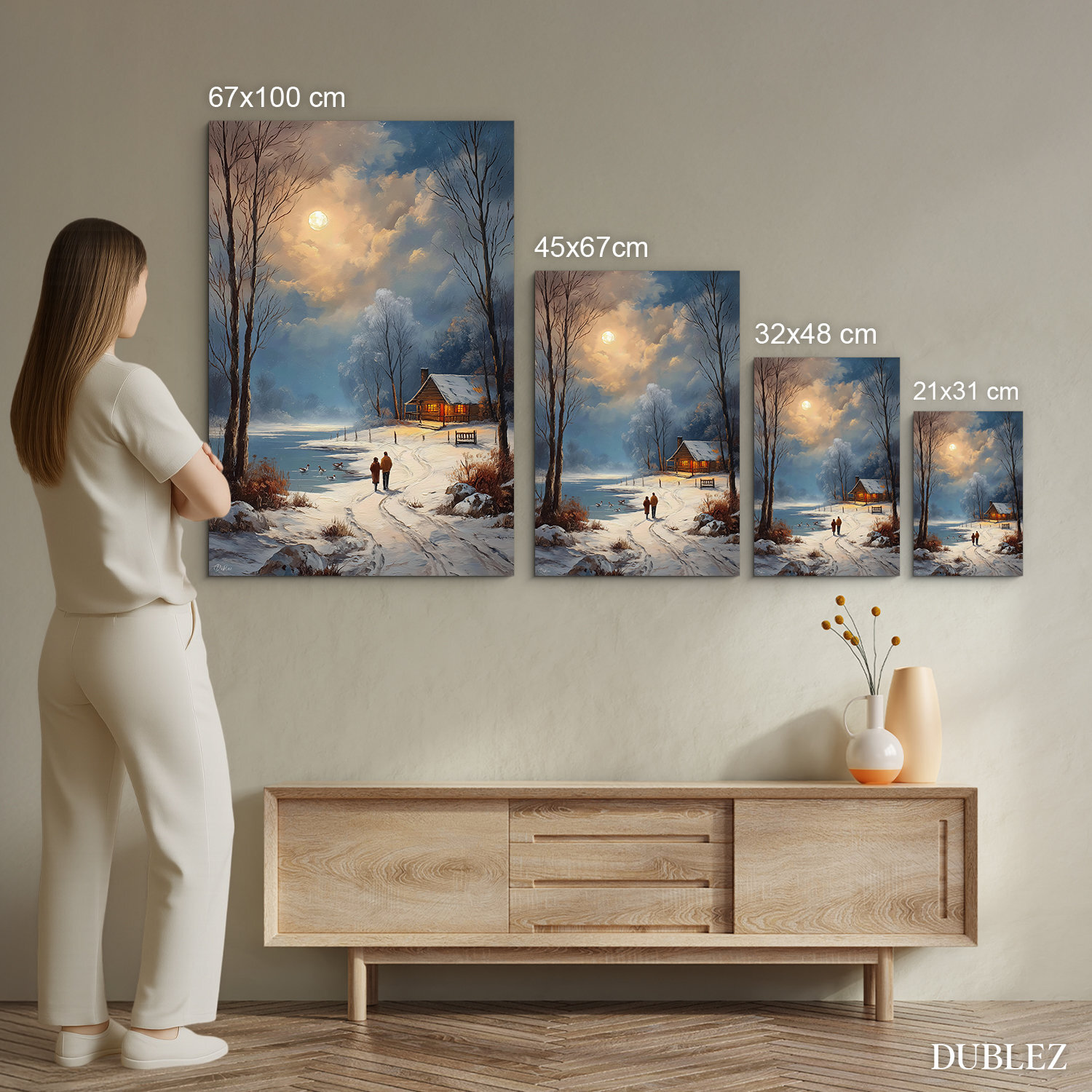 Wall art winter with a snowy landscape, a couple walking and a cottage in the background creates a feeling of peace and homecoming in the interior. Winter painting captures the charm of a winter evening under the moonlight. The combination of the cold landscape and the warm light from the cottage windows feels warm and romantic. The wooden winter painting fits perfectly in the bedroom, living room, cottage, or as an original gift. A decoration that will brighten every winter day and cozy up the home.