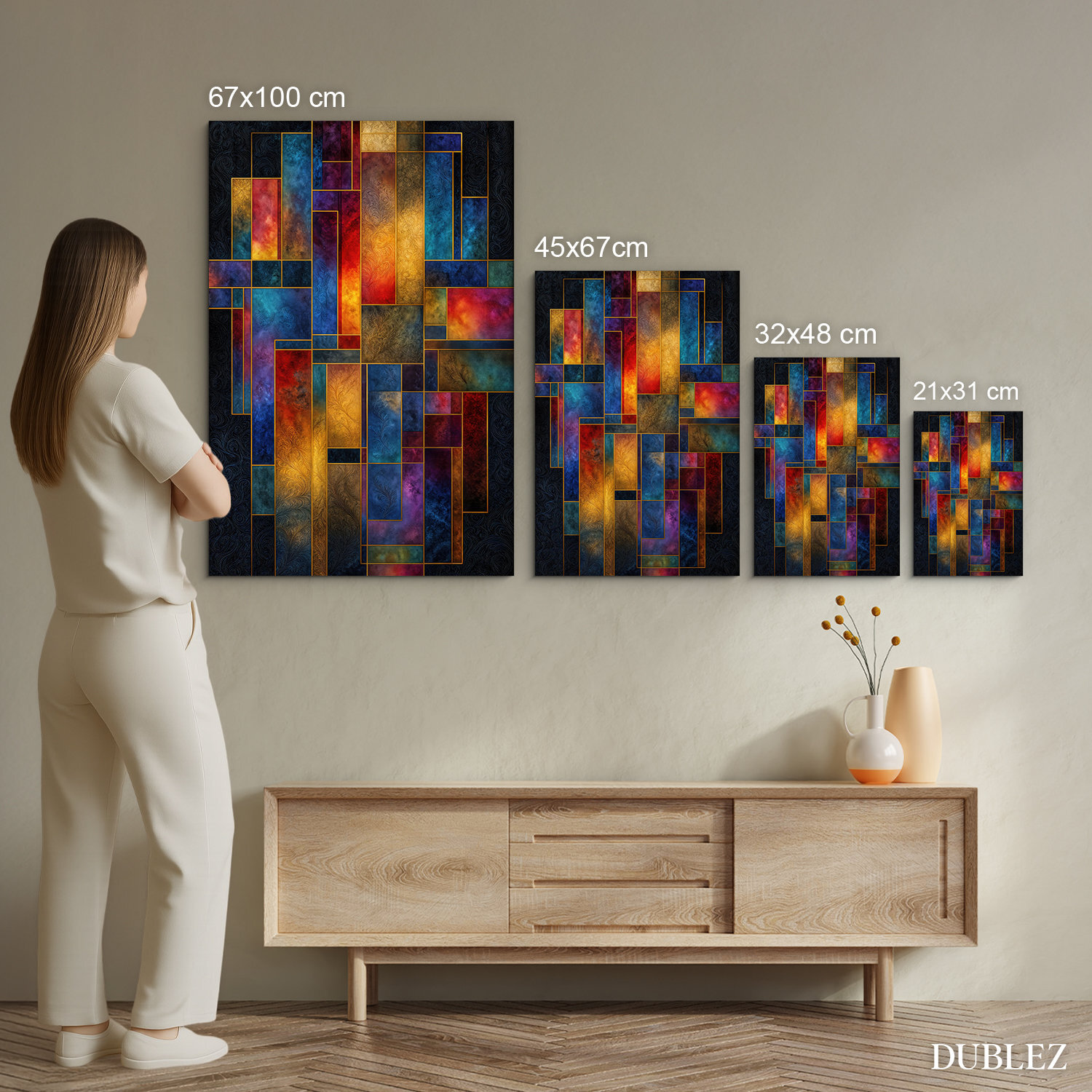 Wooden colored geometric stained glass picture will bring a play of light, colors, and shapes into your interior. Vivid shades of blue, red, yellow, and purple complemented by fine lines create a modern yet luxurious effect. Thanks to its artistic execution and clean design, the picture fits perfectly in an elegant living room, a modern office, or a hallway.