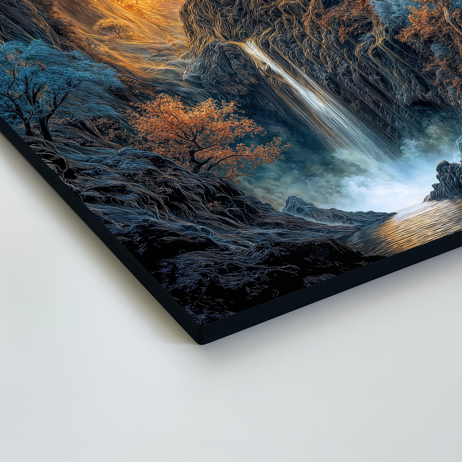 The image of the tree of life with strong roots and golden light in the background creates an unforgettable atmosphere. The tree is planted in a deep valley, and a mysterious waterfall stands out in the details. The wooden image is perfect for the living room or bedroom. The color scheme in shades of gold, blue-gray, and black allows for easy matching with both modern and rustic interiors.
