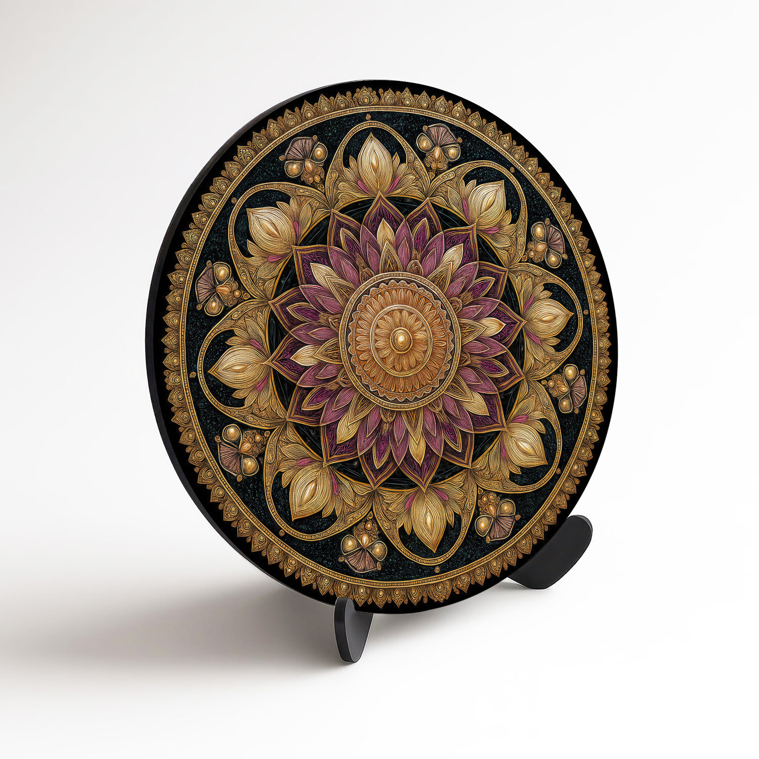 Circular mandala painting on wood is an artistic expression of inner balance and spiritual depth. The intricately crafted mandala in gold and soft purple stands out against a deep dark background. The artistic processing with an emphasis on symmetry brings a sense of order to any living room.