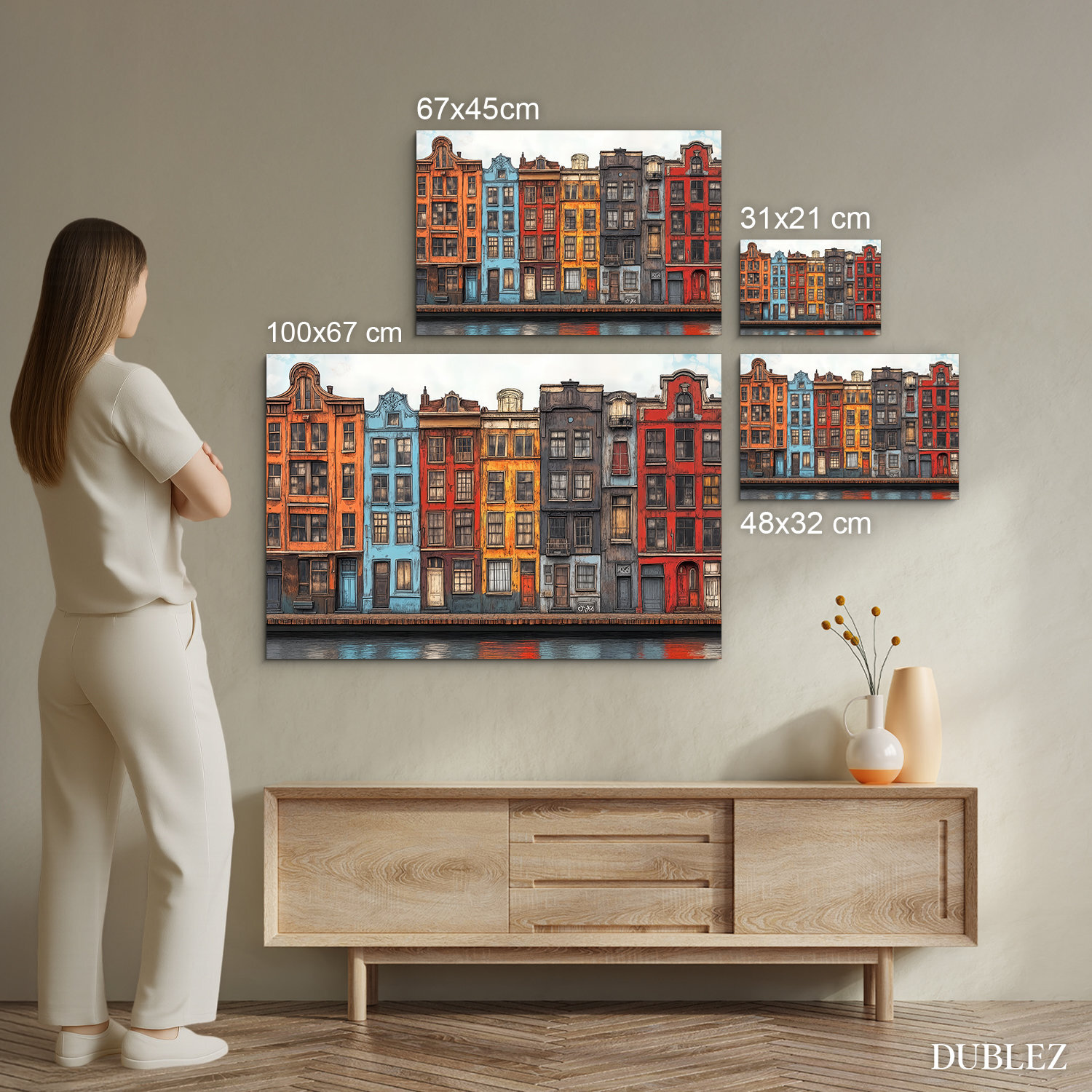 Wooden picture of Amsterdam with colorful houses by the canal will bring the atmosphere of the historical center of the Netherlands into your interior. Vibrant facades of iconic "canal houses", reflecting on the water's surface, appear playful yet elegant. UV printing on wood faithfully captures the details of the architecture, the texture of the walls, and the subtle reflections in the water, making the picture resemble a hand-painted piece. It fits perfectly in a living room, office, or study.