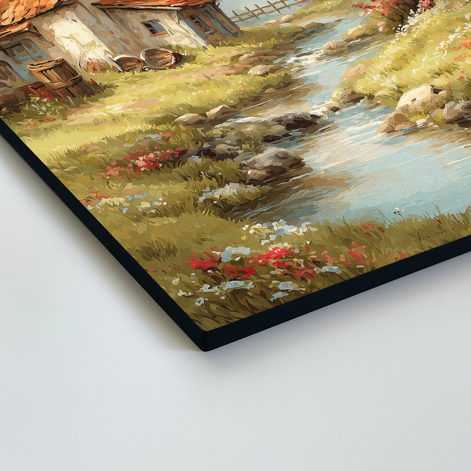 Picture of a rural landscape with a blooming cherry tree and a mountain stream will bring a peaceful atmosphere and the scent of nature into your interior. The rural picture captures an old cottage, a gently babbling stream, and a pink-blooming tree. A colorful picture will brighten up any room, you can place it in the living room, bedroom, or cottage. Great as an original gift for nature lovers and rural style enthusiasts.