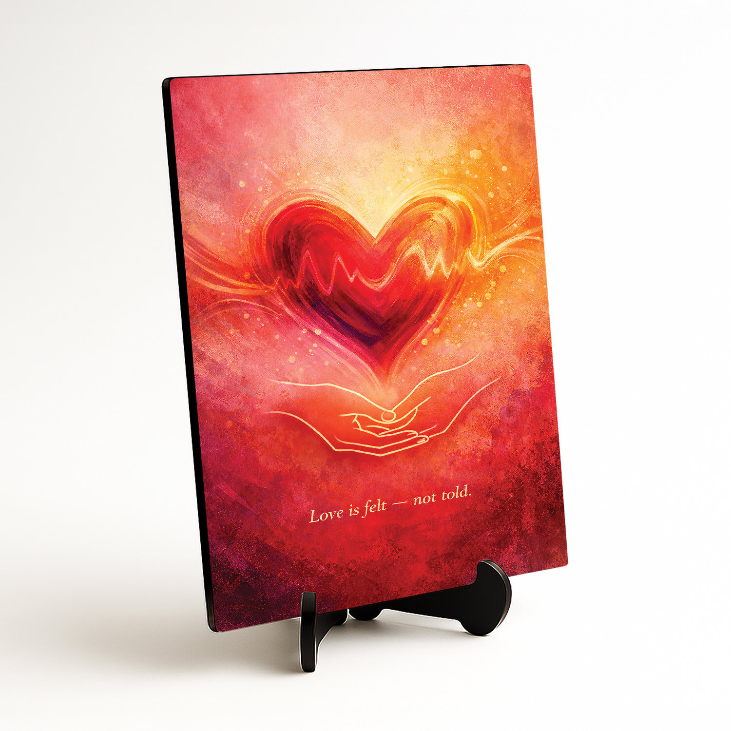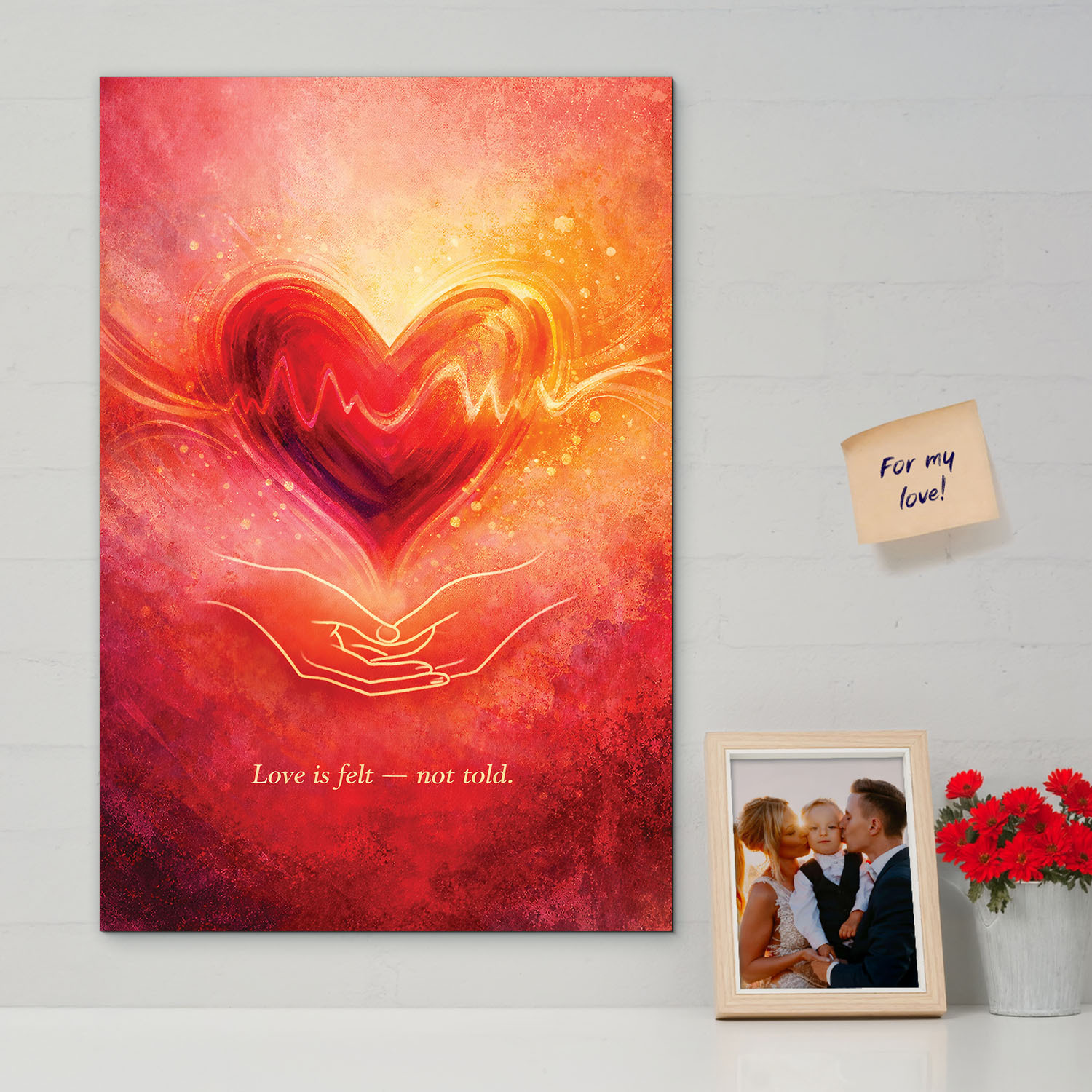 Wooden picture of love in rich red and gold colors captures the moment when words are not enough. A glowing heart with a heartbeat line, gently supported by hands, complemented by an English quote: “Love is felt – not told.” It is a perfect Valentine's gift for a wife or partner, which will fit perfectly into the bedroom or living room.