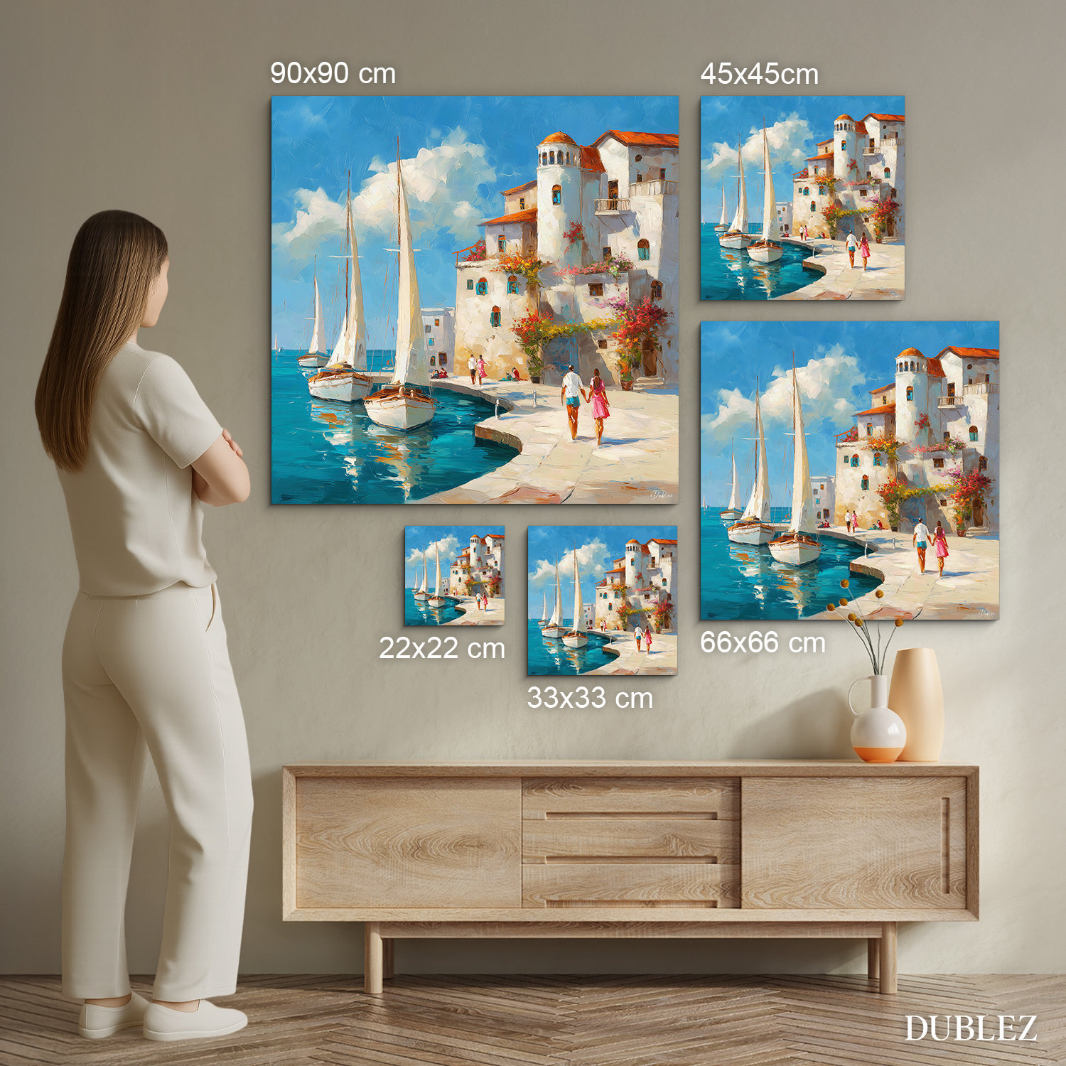 Wooden picture of a seaside town for the wall captures the sunny coast with blue sea, anchored sailboats, and typical Mediterranean architecture. White houses with terracotta roofs, colorful shutters, and blooming flowers on the walls create a holiday atmosphere. A couple in summer clothes walks along the promenade, adding lightness and life to the picture. The colorful image looks like a painting – the saturation of colors and fine texture will brighten any room. It will fit perfectly in the living room, kitchen, bedroom, or office.