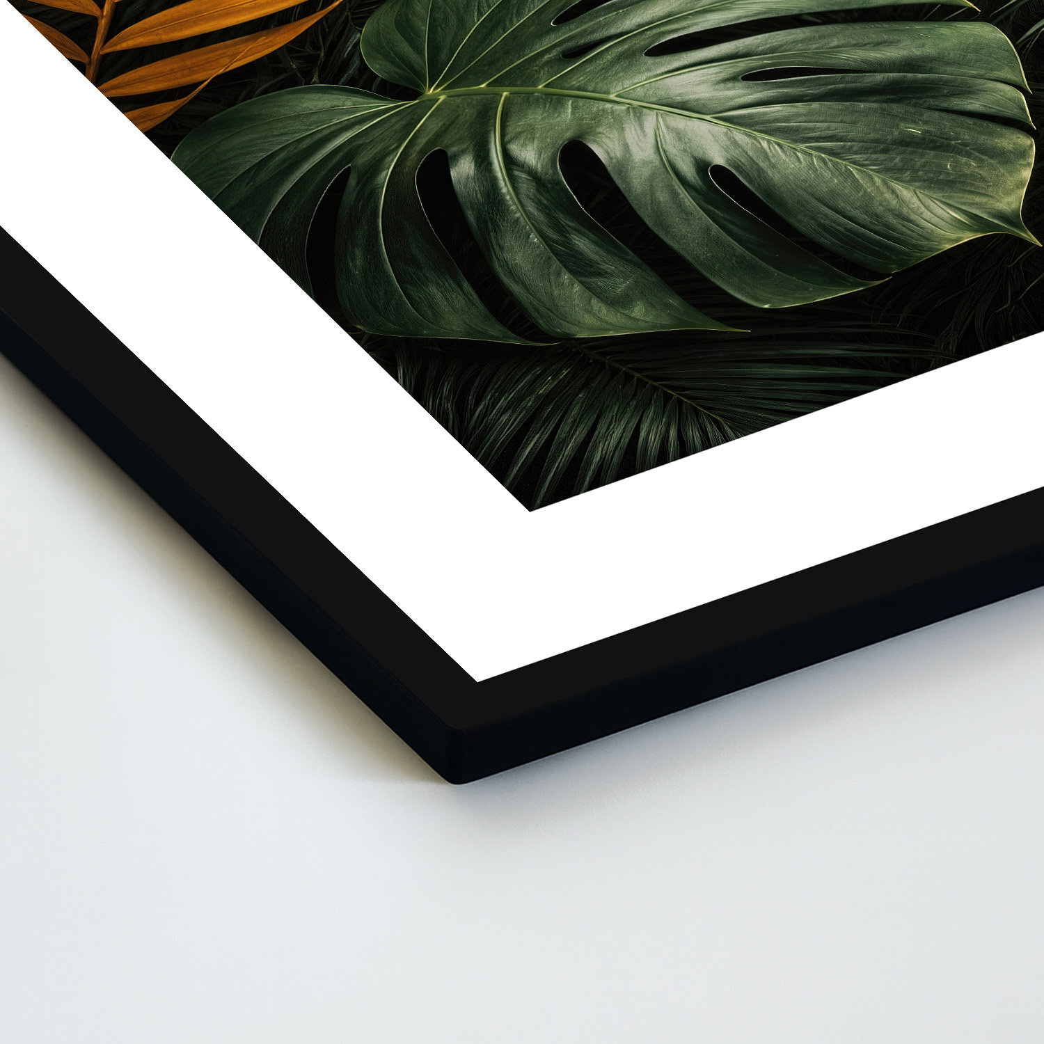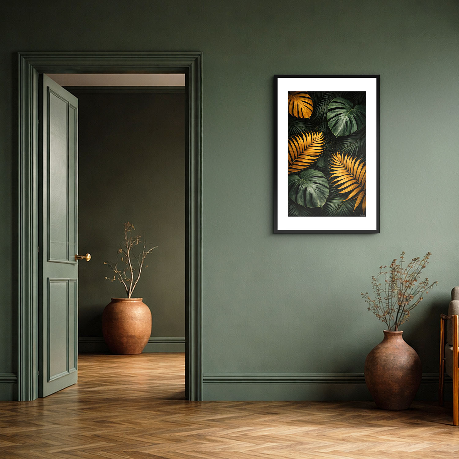Wooden picture of tropical leaves captivates with the contrast of dark green and gold shades, which appear modern and elegant. The picture is complemented by a stylish mat, which creates a framing effect and visually separates the motif from the surroundings. This makes the picture look more luxurious and cleaner. It fits well in the living room, hallway, bedroom, or office, especially in interiors with a modern, minimalist, or industrial style. It stands out excellently on its own, but also as part of a larger gallery of pictures.