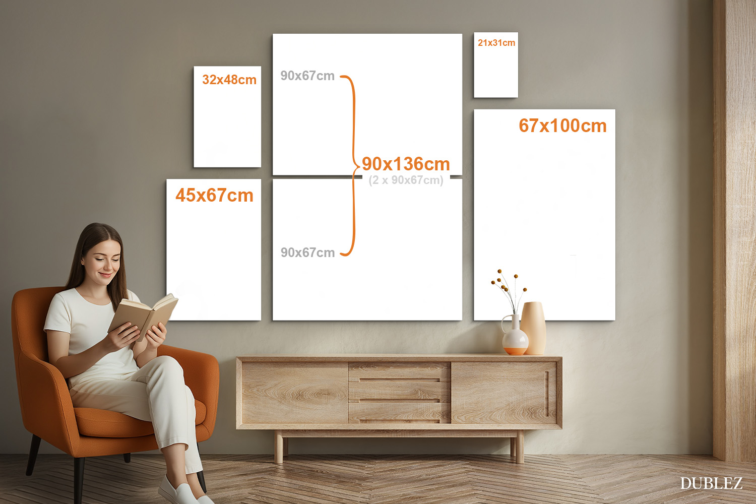 - 21x31 cm, 32x48 cm, 45x67 cm, 67x100 cm - The wall art consists of one piece.