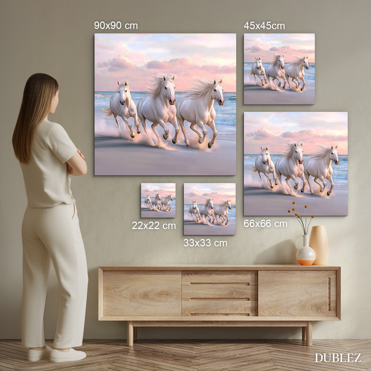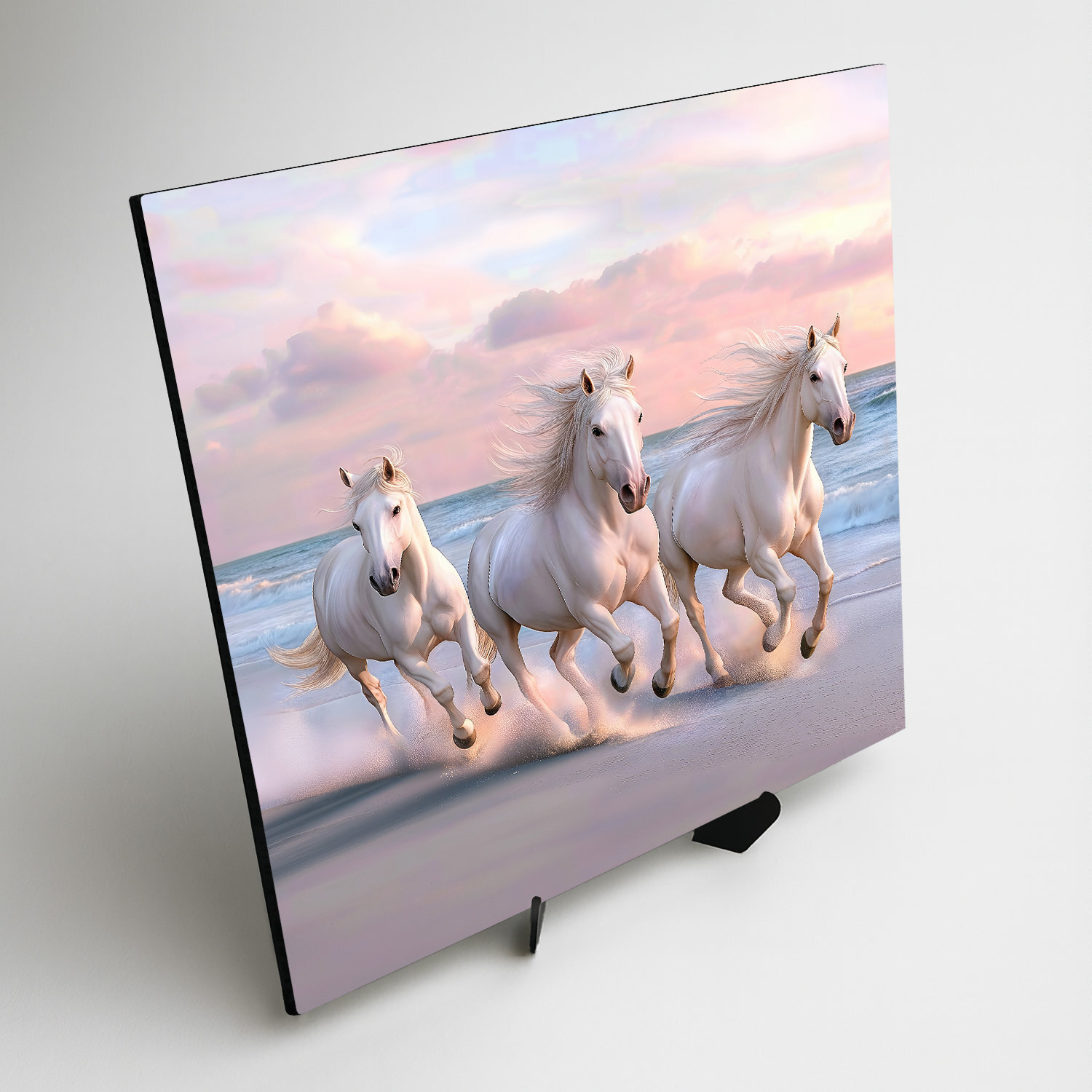 Wooden Wall Art – White Horses brings a sense of peace and freedom into your home. A trio of white horses running along the beach in the soft light of the setting sun creates a calming atmosphere. The wall art has a clean and serene look, making it a perfect fit for bright, airy spaces – such as the living room, bedroom, or hallway.