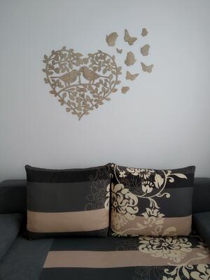 The wall art birds in a heart surrounded by tree leaves is a beautiful wooden decor. It will bring a touch of love, summer days, and nature to your home or apartment. The birds hold a key and a lock in their beaks as a declaration of love. The wooden wall decor is also a beautiful gift for a loved one.